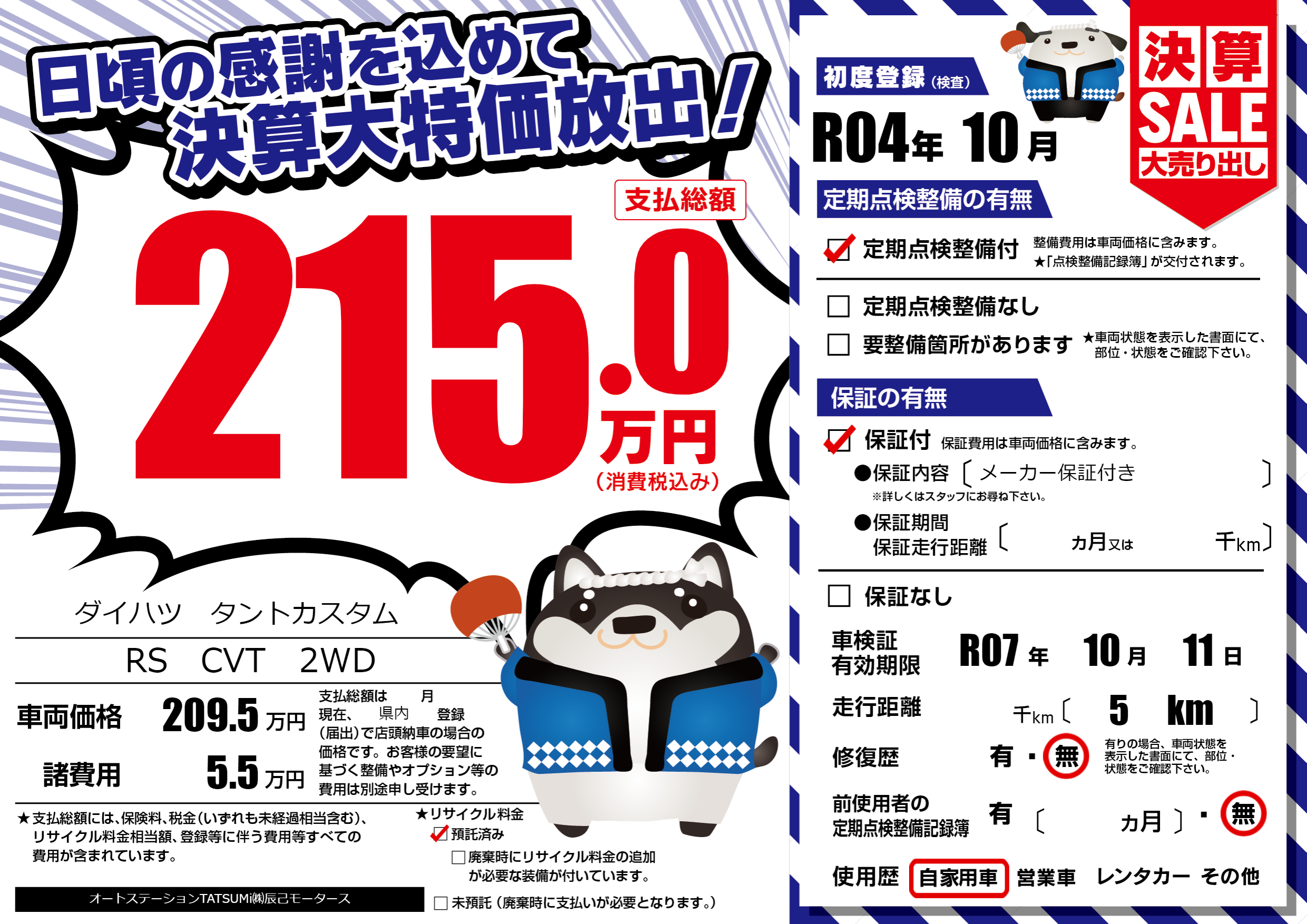 | 車名 | ダイハツ タントカスタム | グレード ミッション 排気量 |