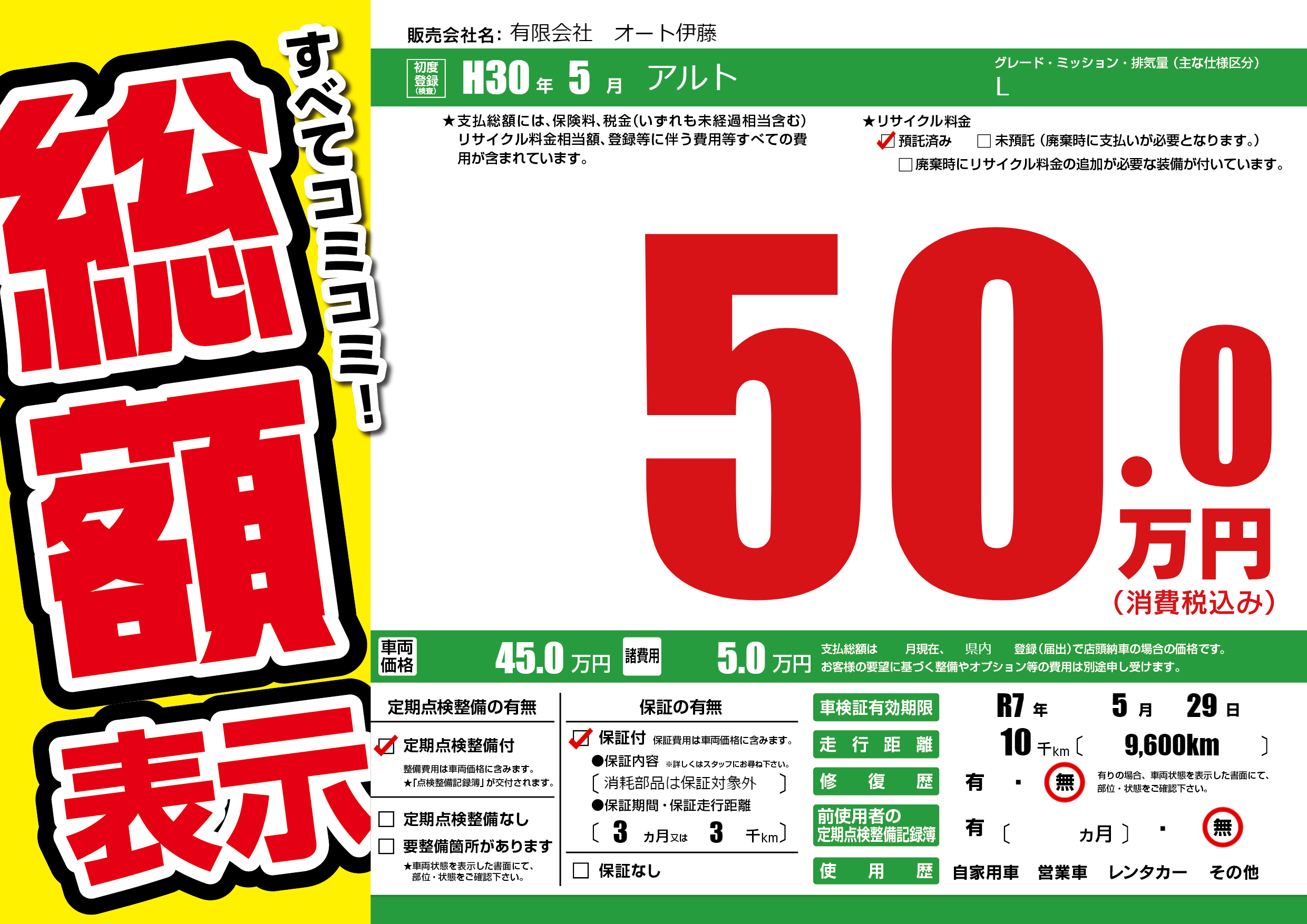 | 走行キロ | 1万km | 初年度登録 | H30年5月 |