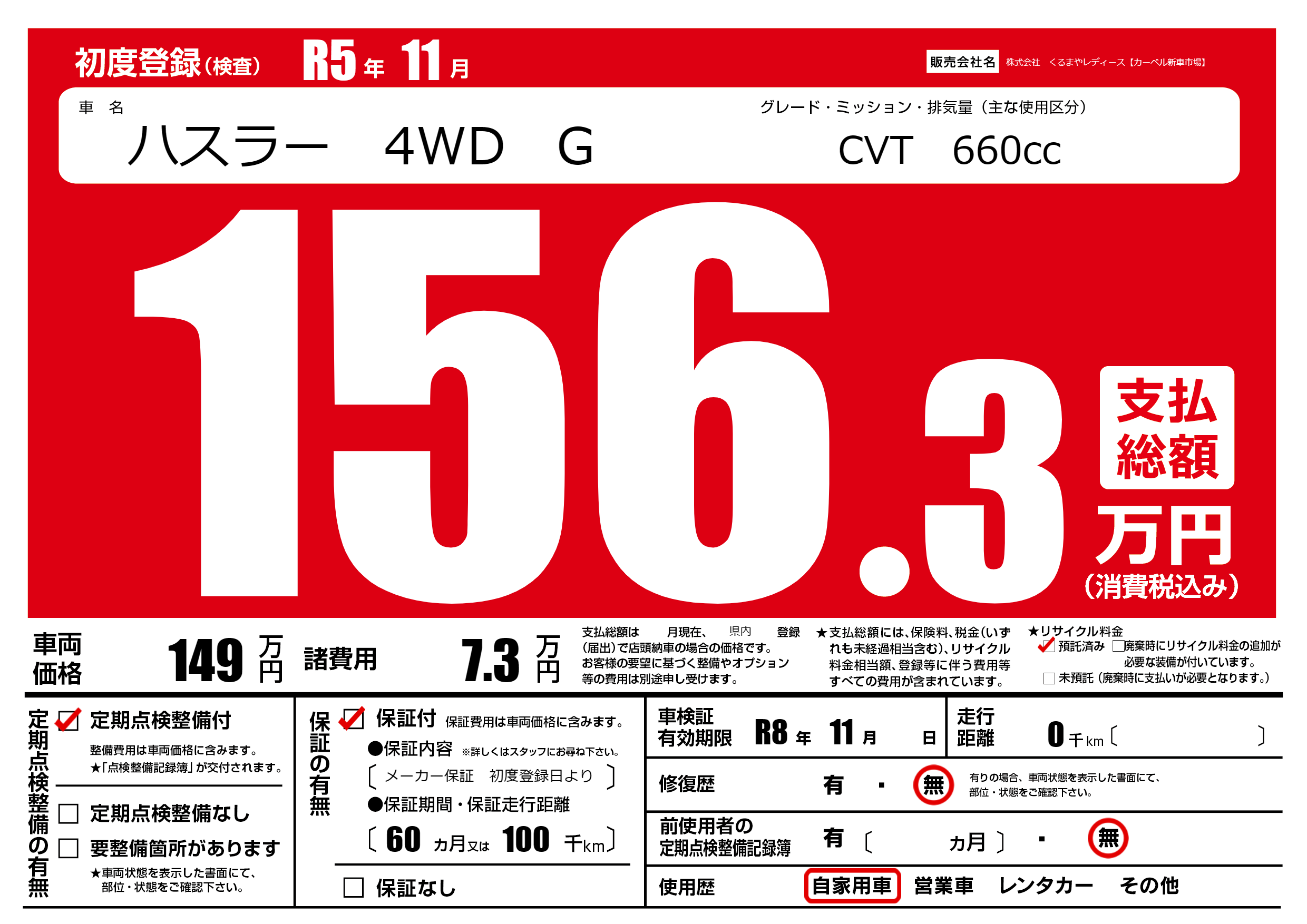 | 車名 | ハスラー 4WD G | グレード ミッション 排気量 |