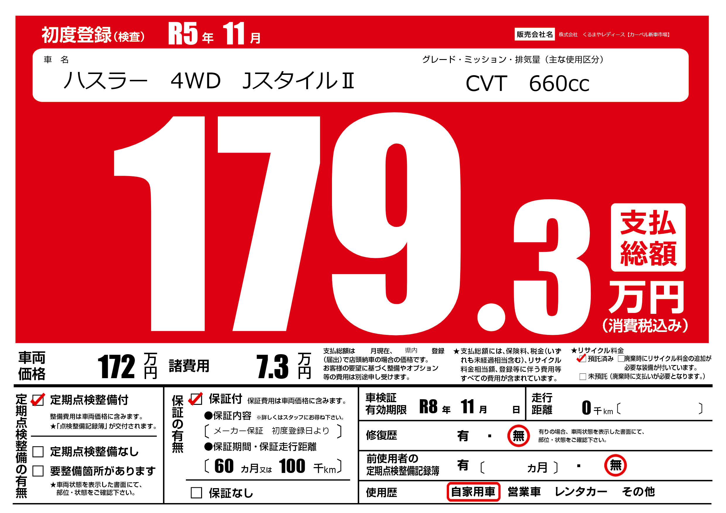 | 車名 | ハスラー 4WD JスタイルⅡ | グレード ミッション 排気量 |