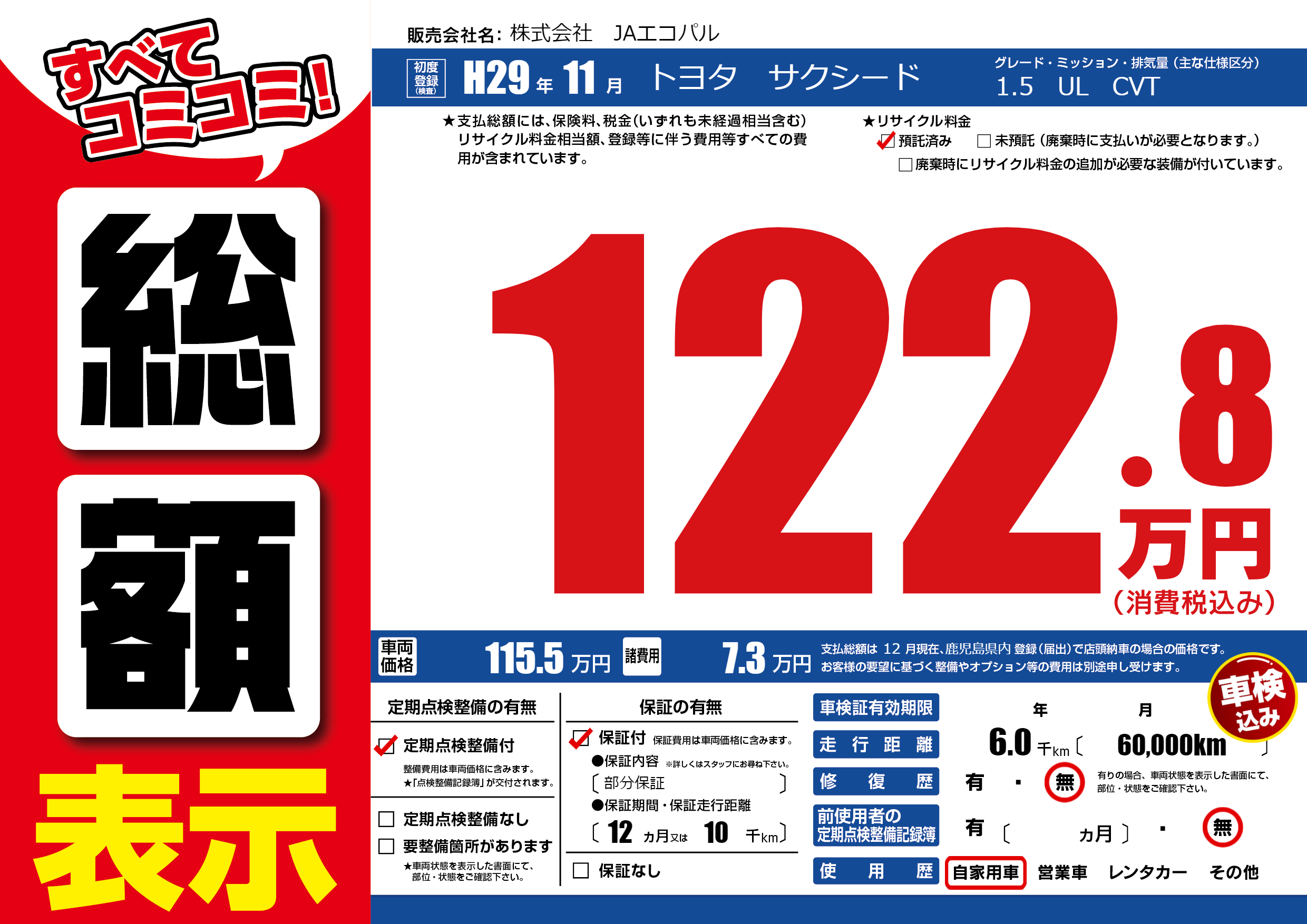 | 車名 | トヨタ サクシード | グレード ミッション 排気量 |