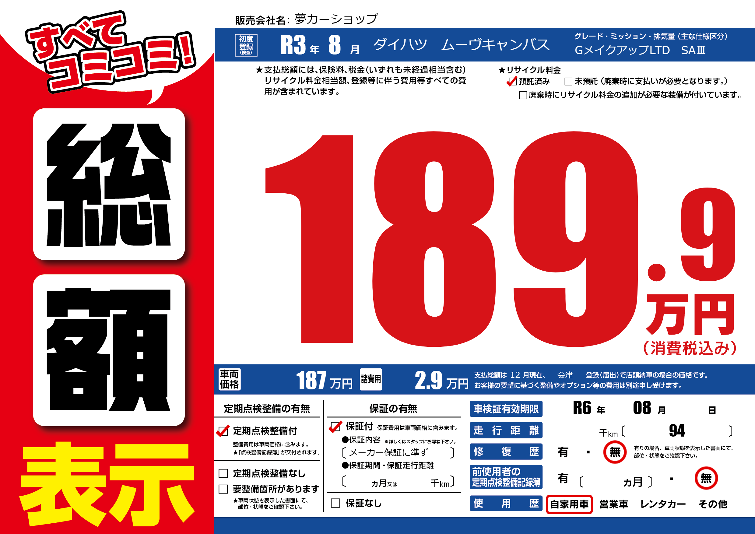 保証付き 保証内容(メーカー保証に準ず) ---ヶ月または()千kmまで |