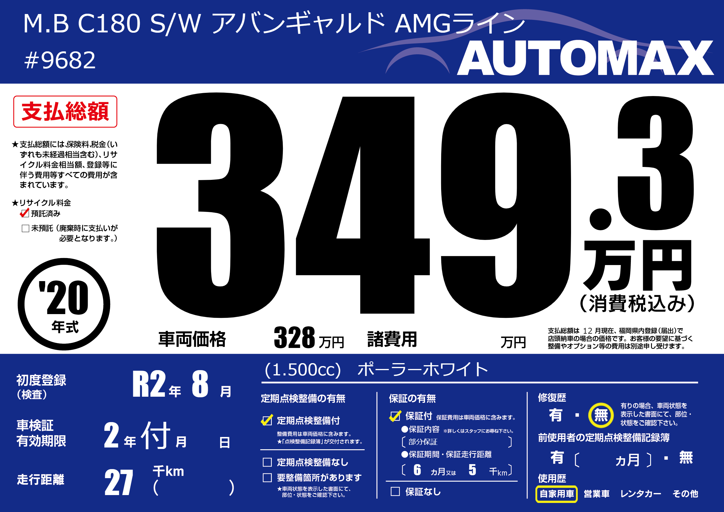| 車名 | M.B C180 S/W アバンギャルド AMGライン | グレード ミッション 排気量 |