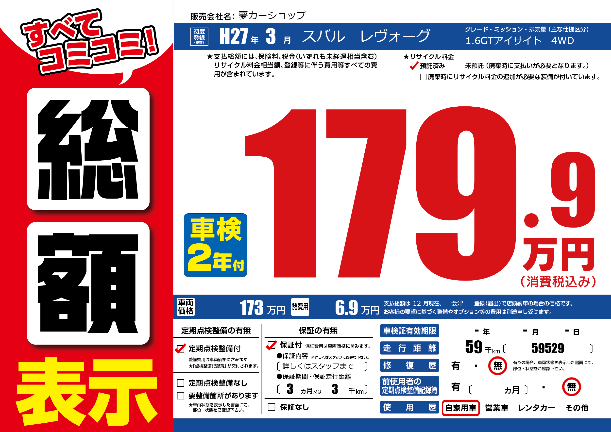 | 車名 | スバル レヴォーグ | グレード ミッション 排気量 |
