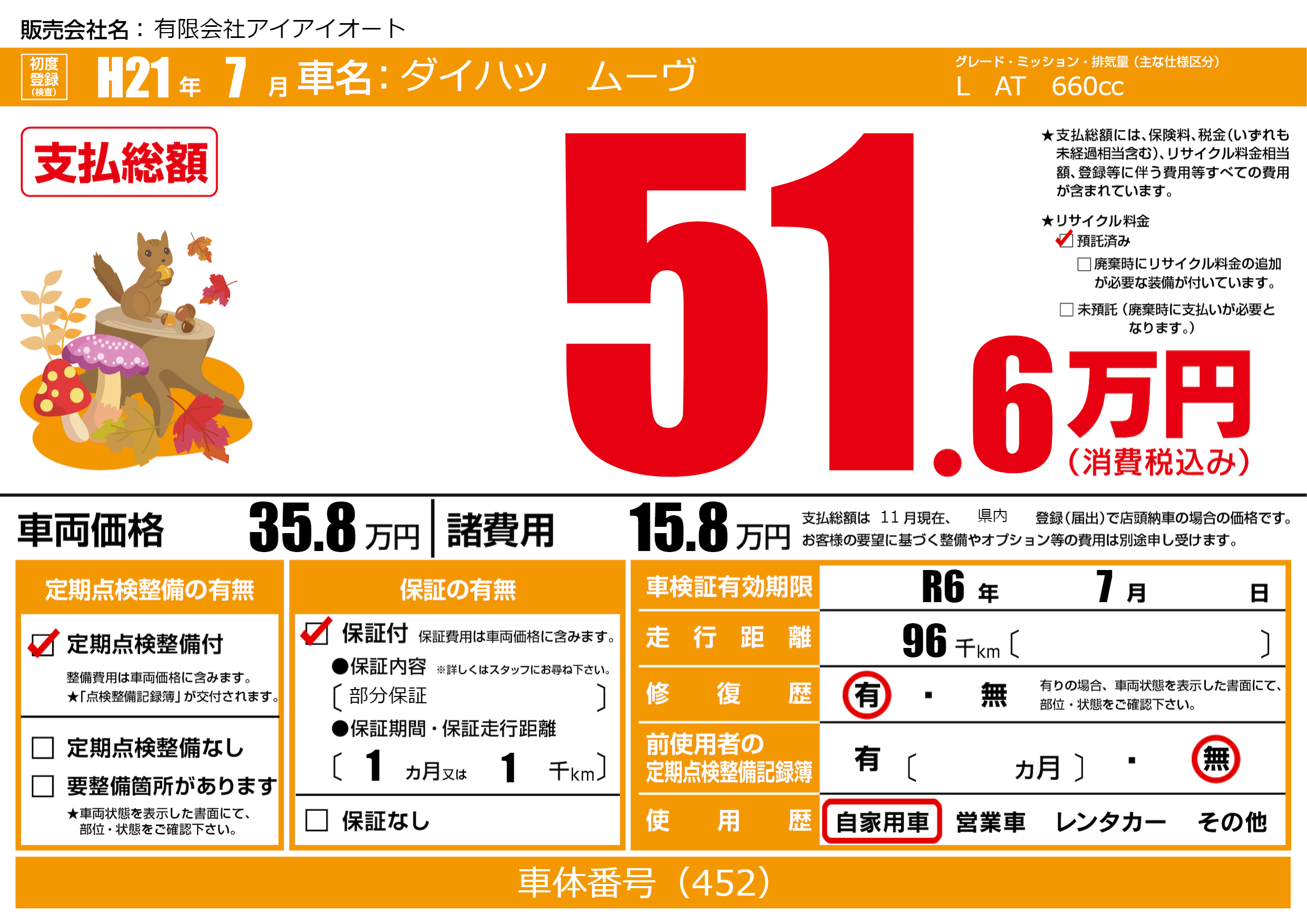 | 車名 | ダイハツ ムーヴ | グレード ミッション 排気量 |