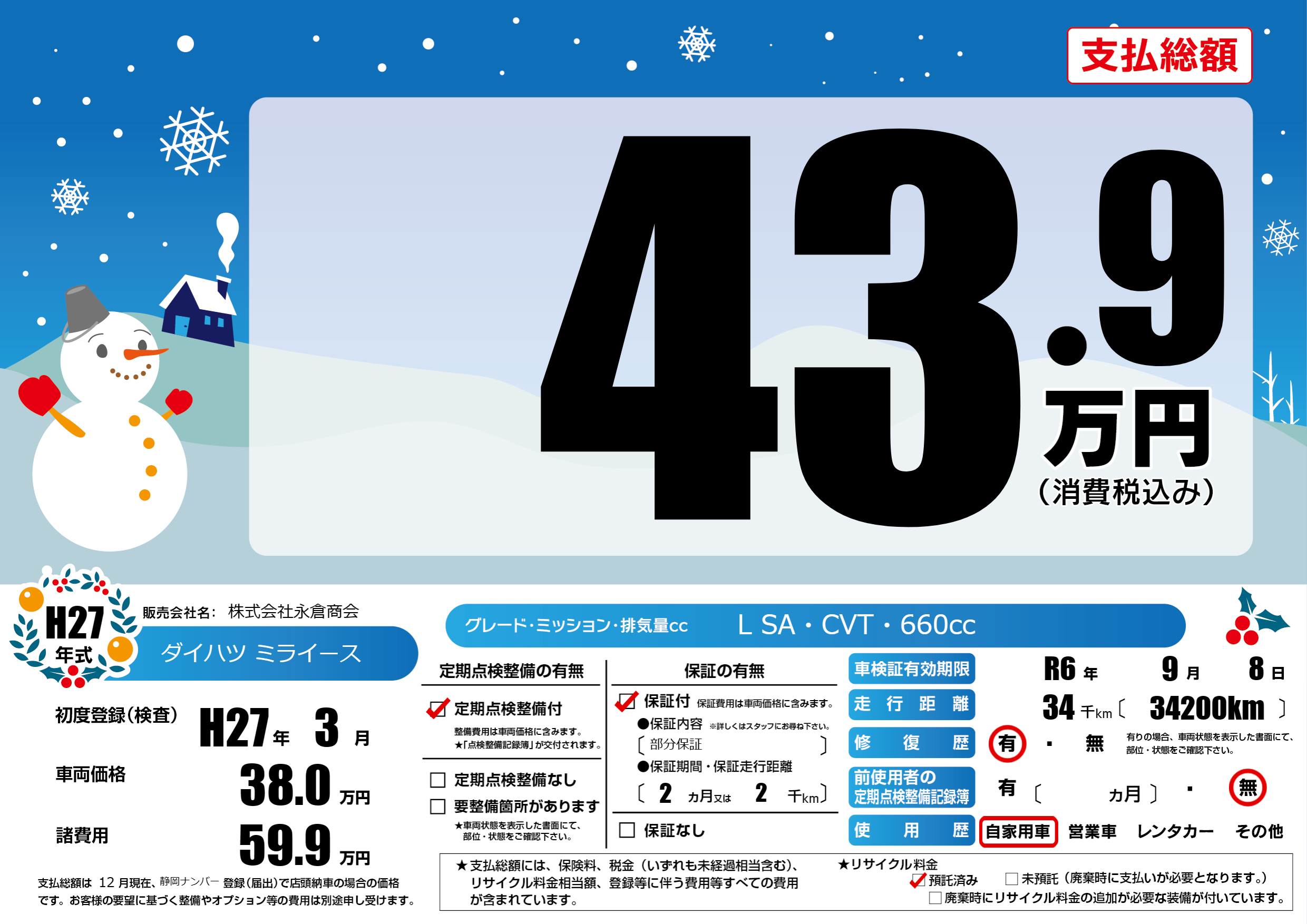 | 走行キロ | 3.4万km | 初年度登録 | H27年3月 |