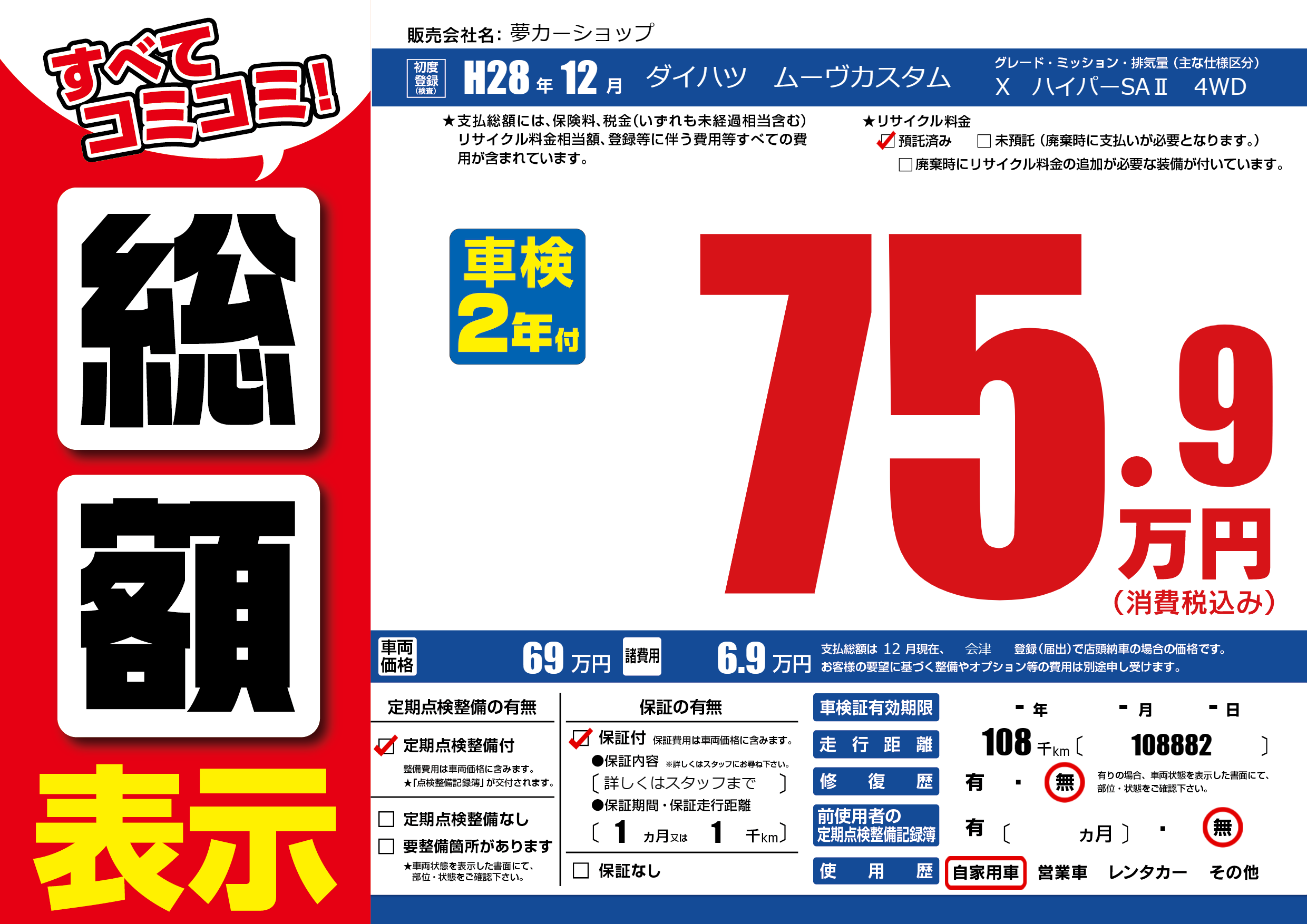 | 走行キロ | 10.8万km | 初年度登録 | H28年12月 |