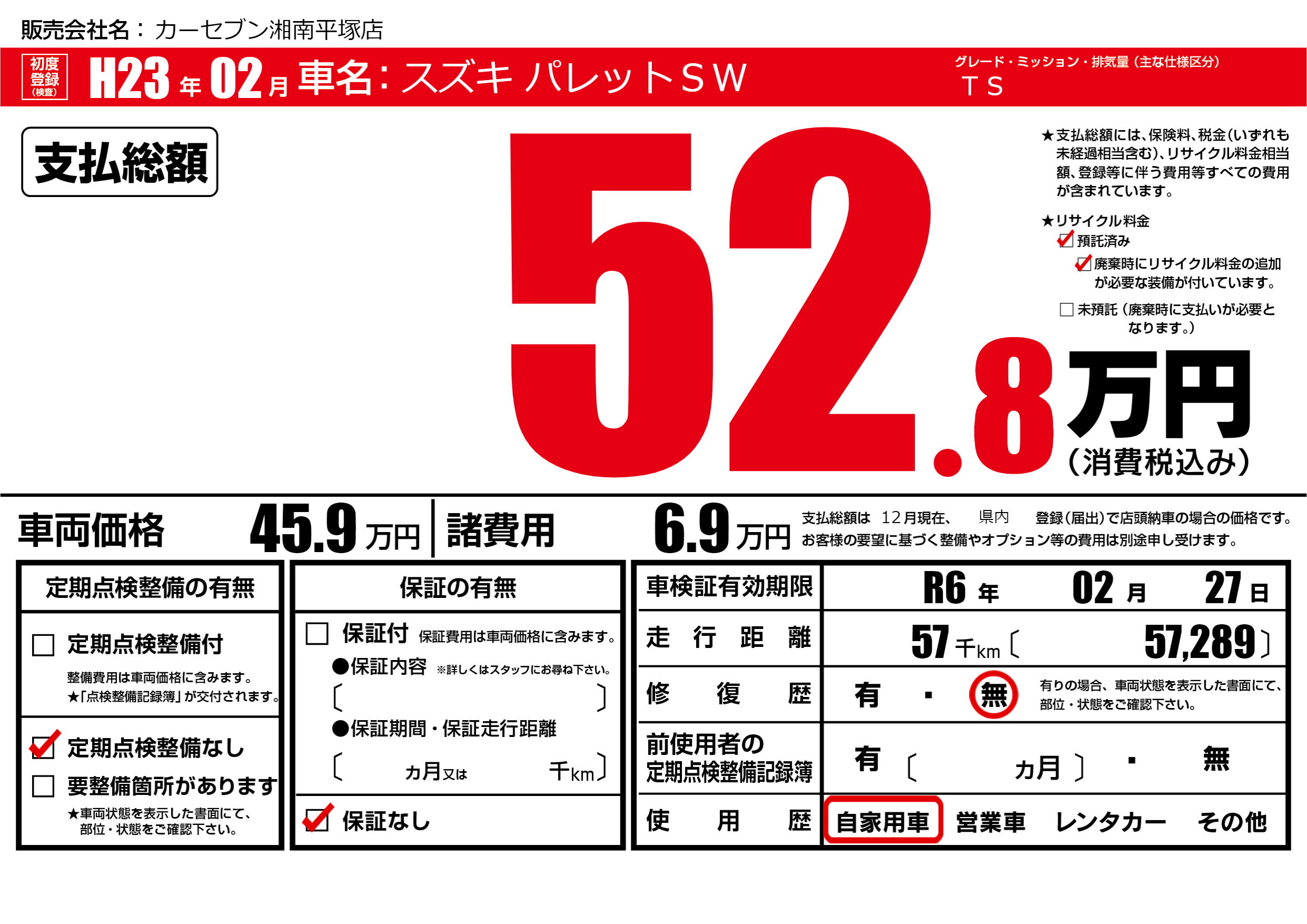 | 走行キロ | 5.7万km | 初年度登録 | H23年02月 |