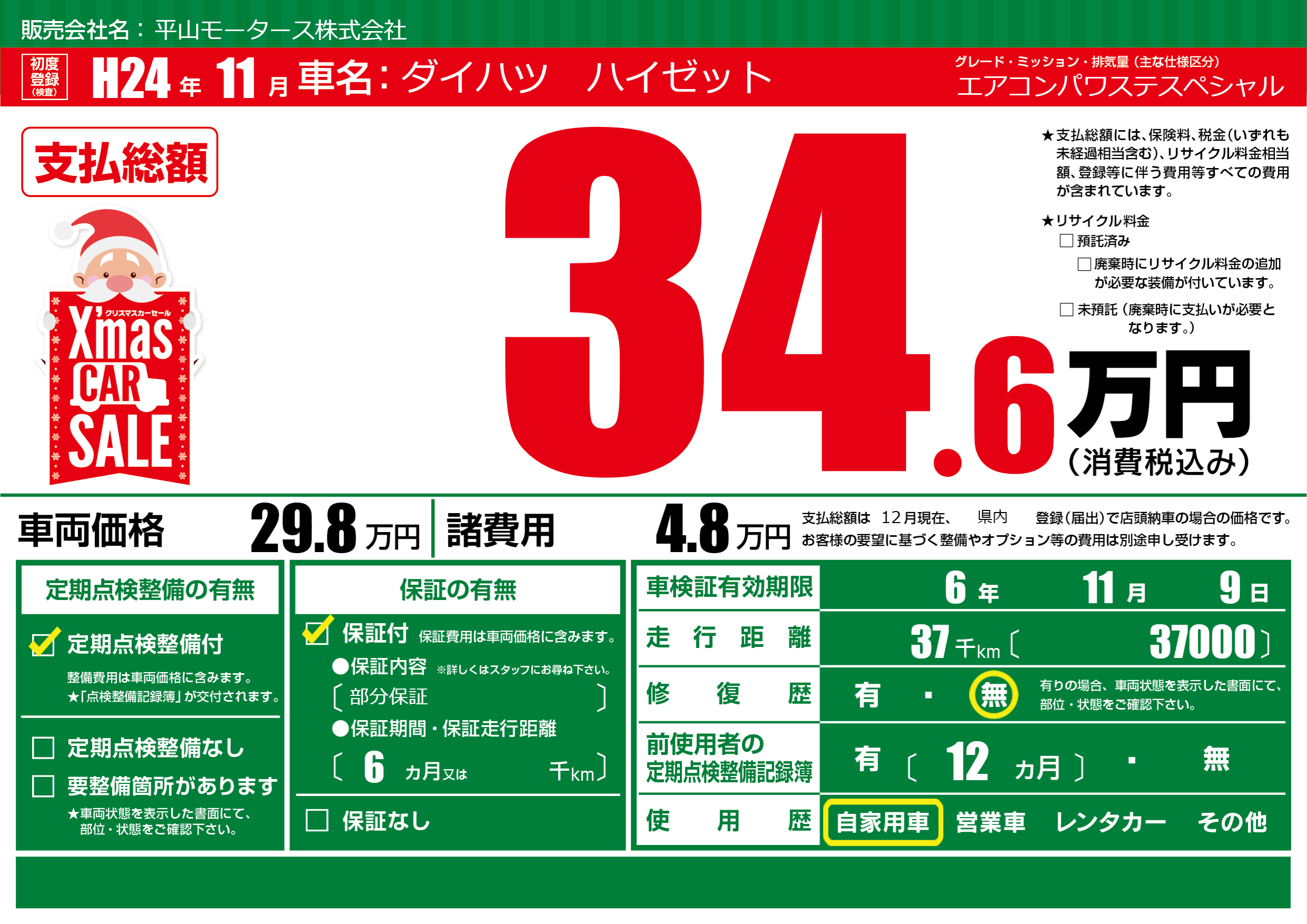 | 走行キロ | 3.7万km | 初年度登録 | H24年11月 |