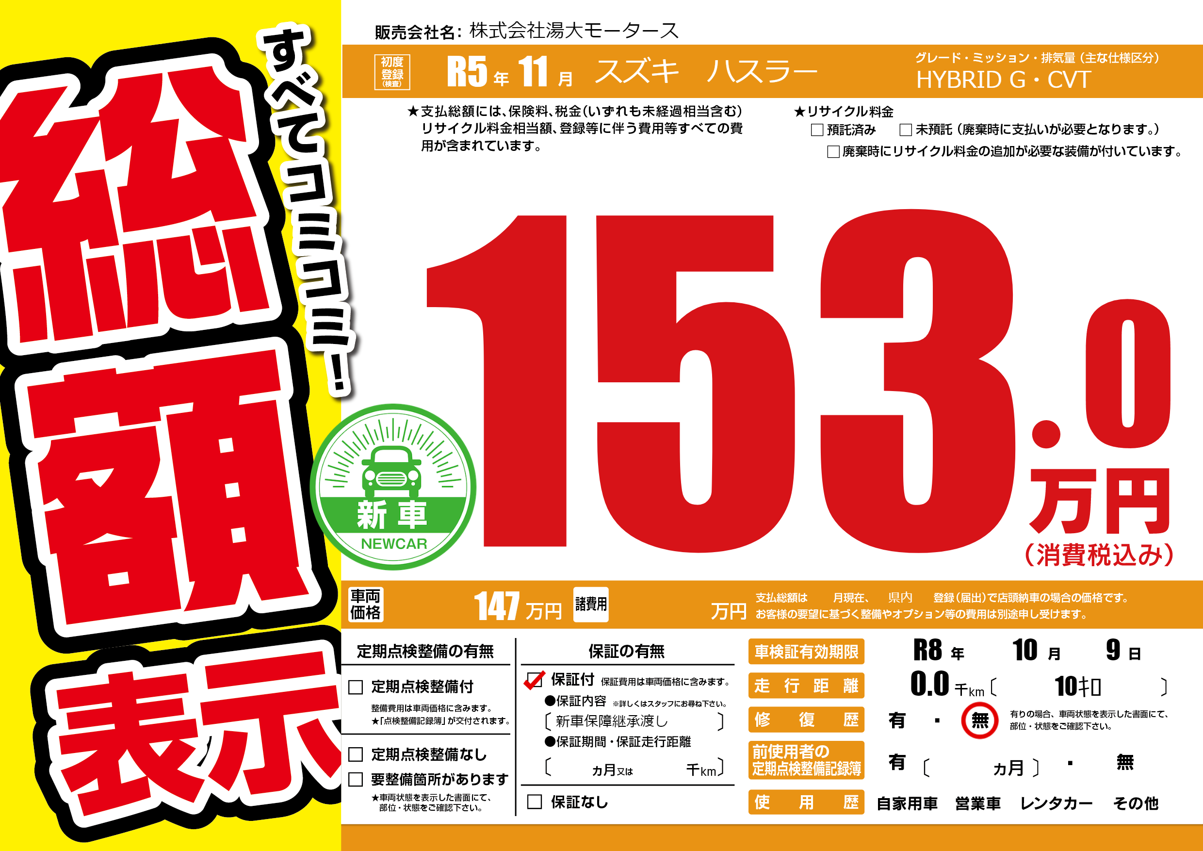 | 車名 | スズキ ハスラー | グレード ミッション 排気量 |