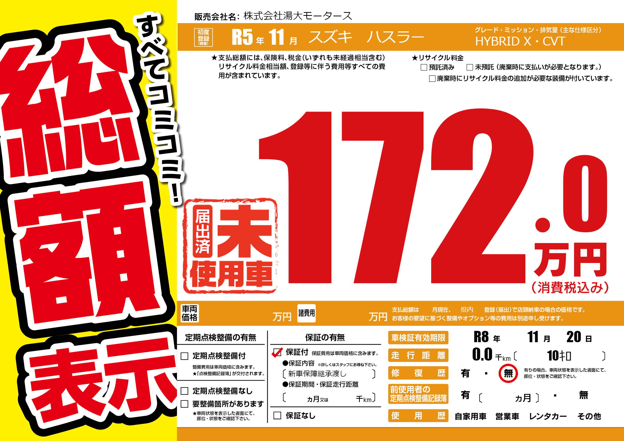 保証付き 保証内容(新車保障継承渡し) ヶ月または千km |