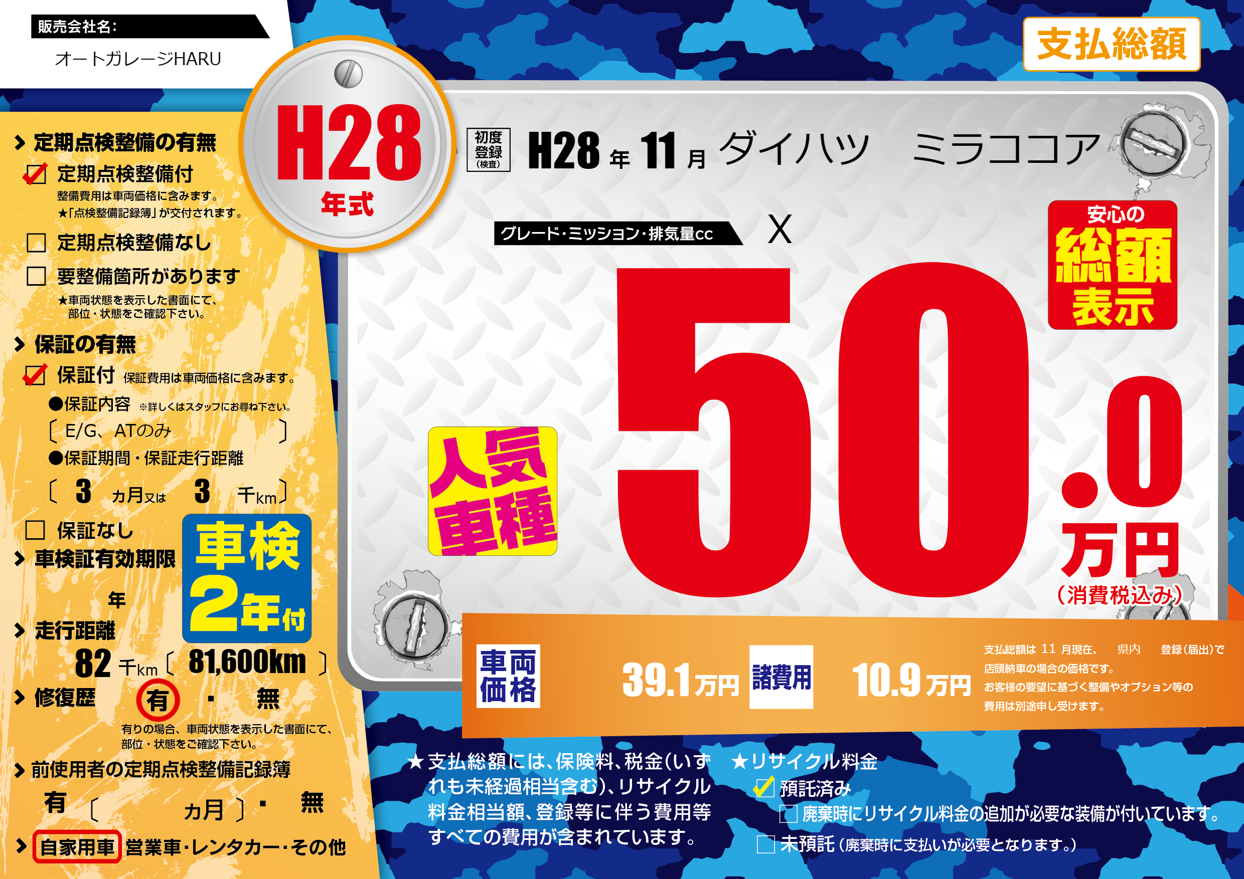 | 車名 | ダイハツ ミラココア | グレード ミッション 排気量 |