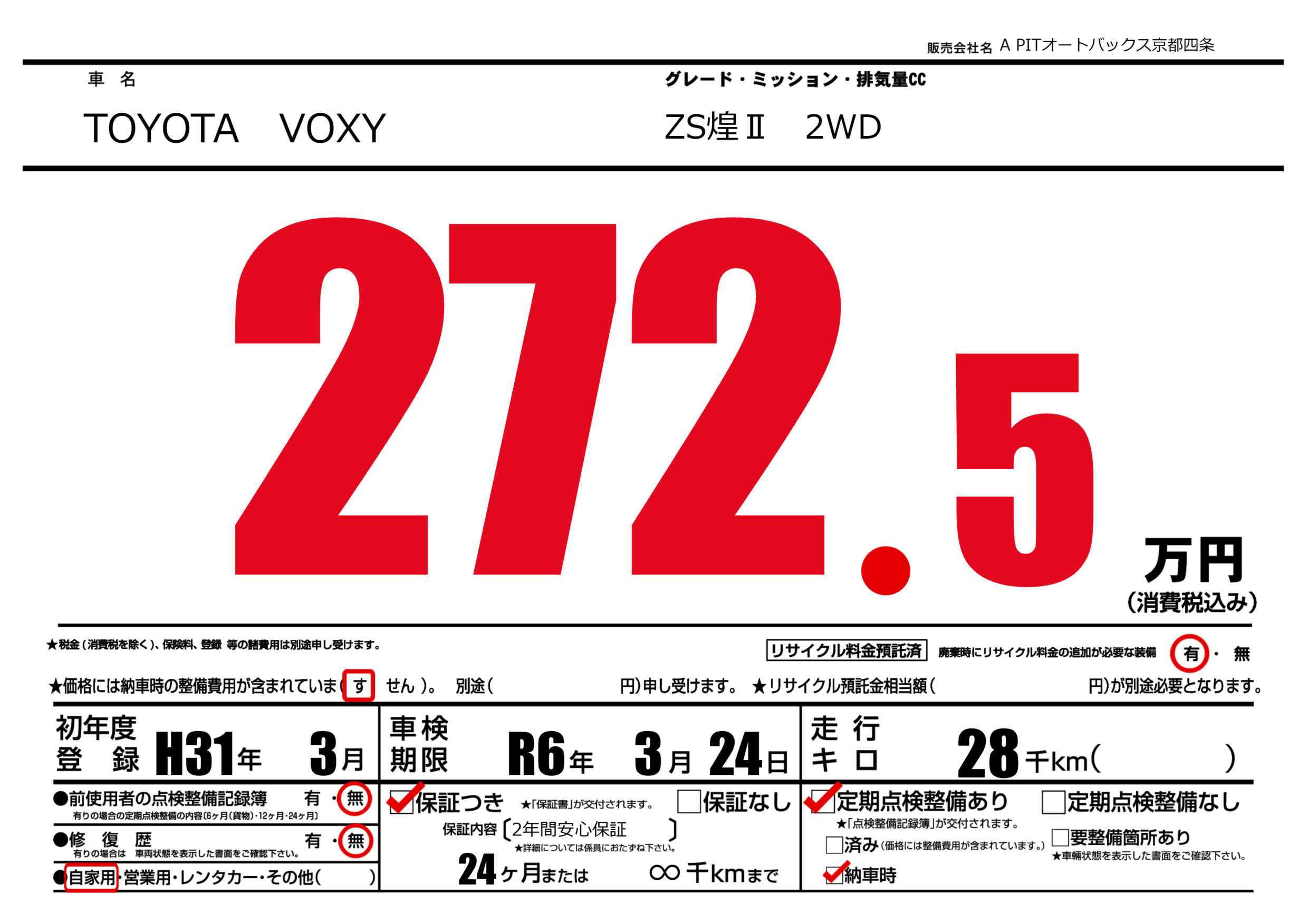 | 車名 | TOYOTA VOXY | グレード ミッション 排気量 |