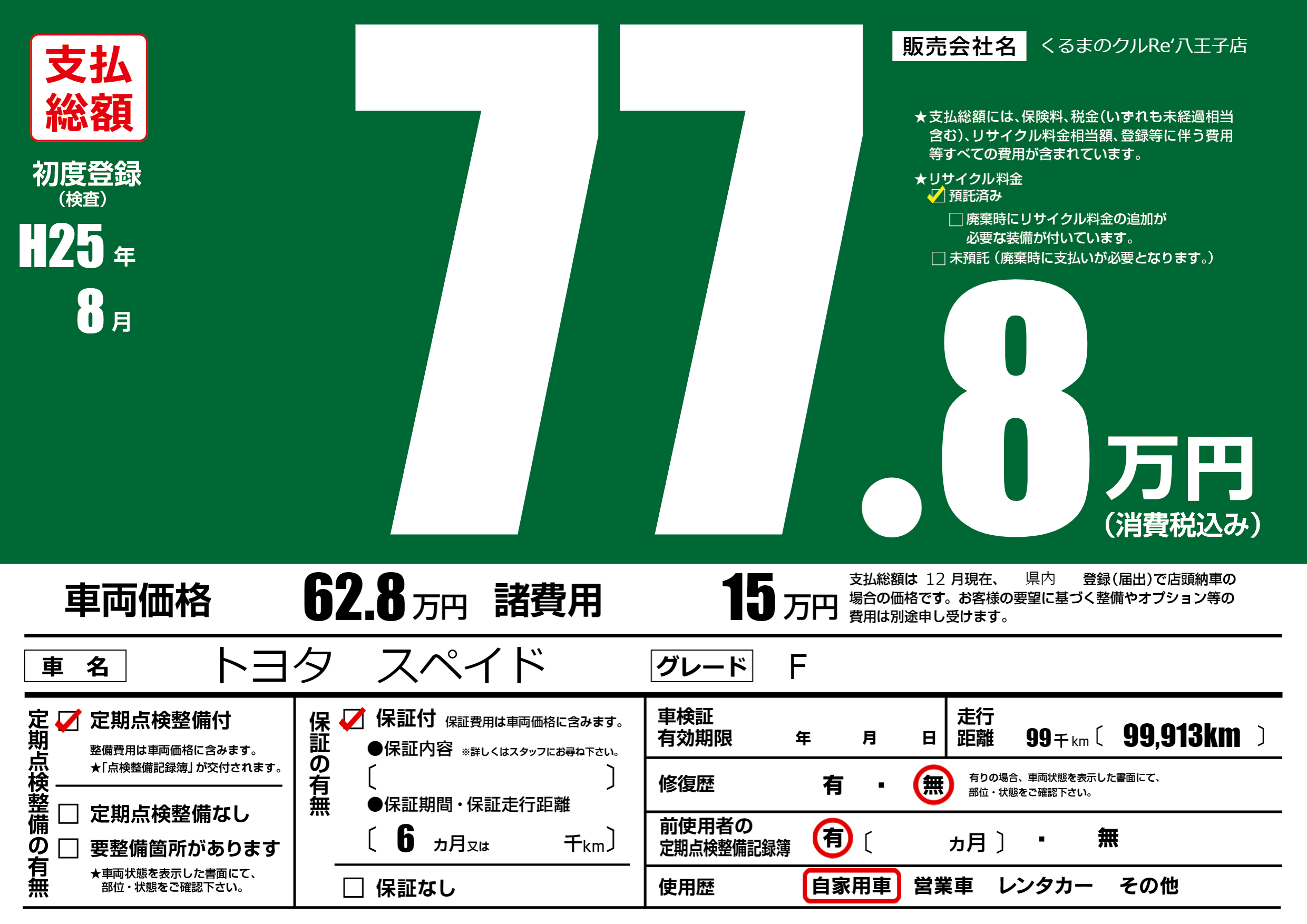 | 車名 | トヨタ スペイド | グレード ミッション 排気量 |