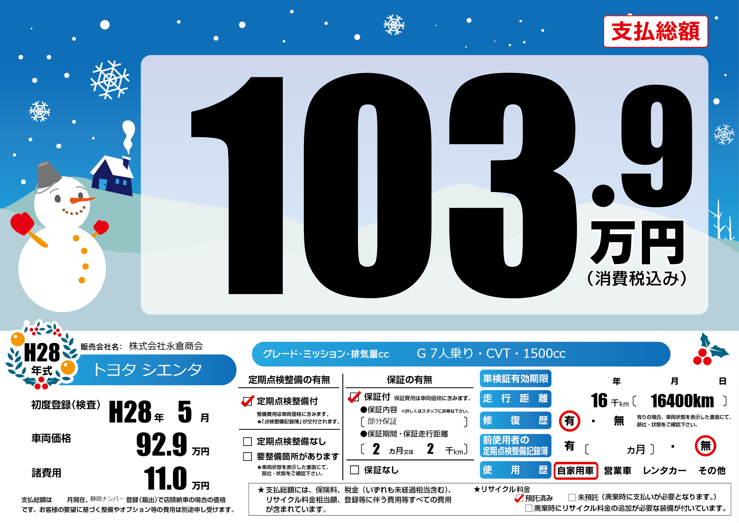| 車名 | トヨタ シエンタ | グレード ミッション 排気量 |