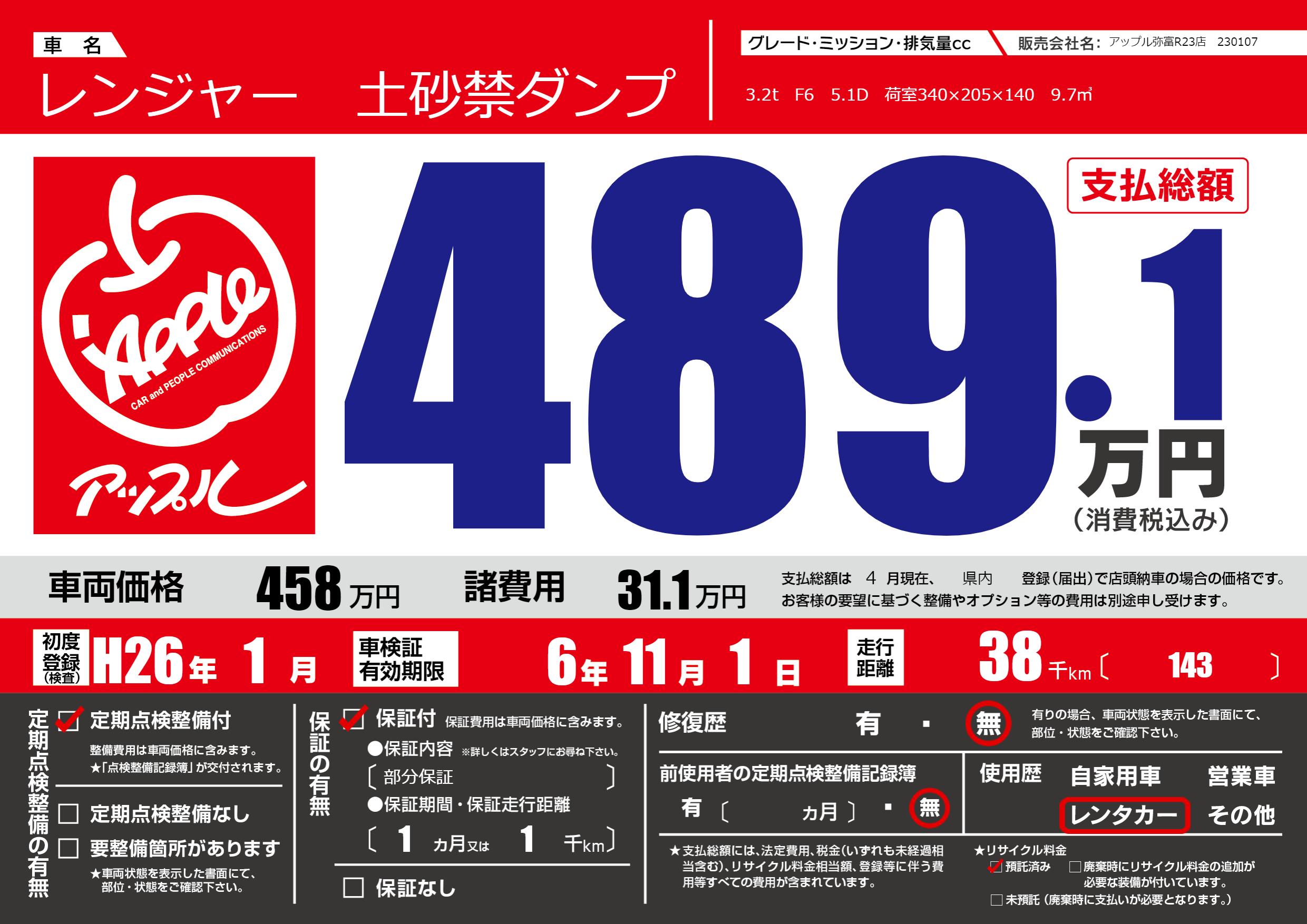 | 車名 | レンジャー 土砂禁ダンプ | グレード ミッション 排気量 |