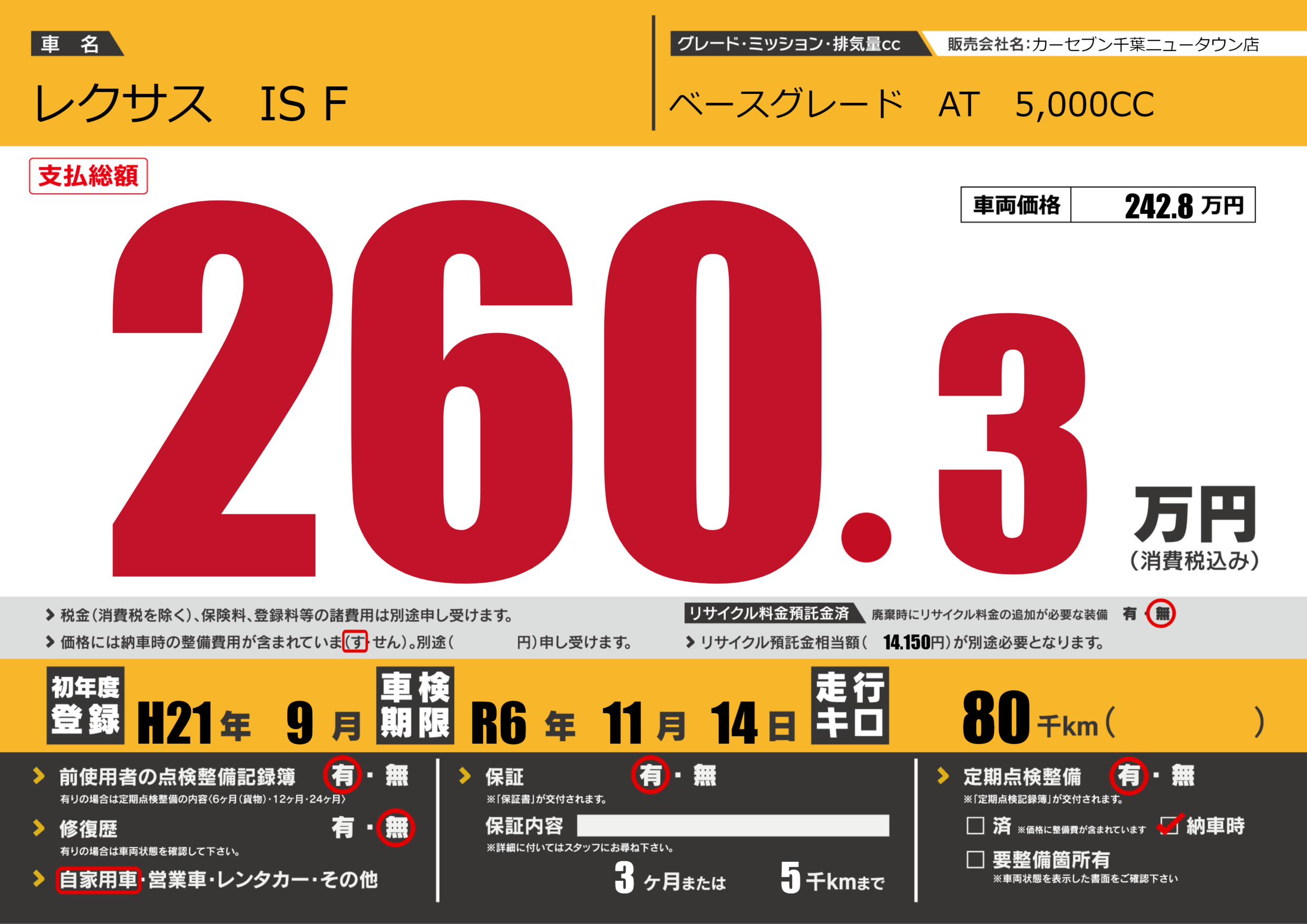 | 車名 | レクサス IS F | グレード ミッション 排気量 |