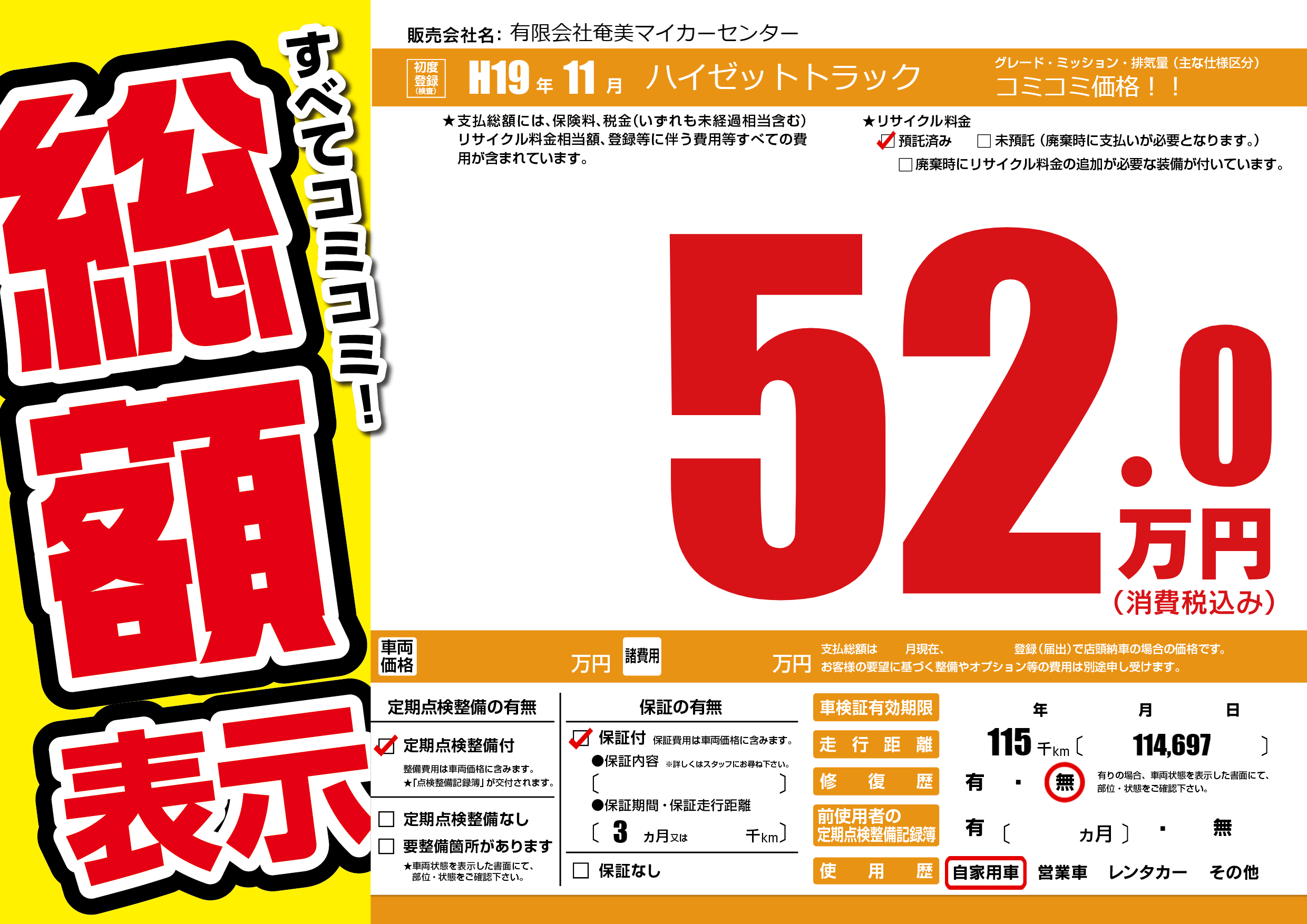 | 走行キロ | 11.5万km | 初年度登録 | H19年11月 |