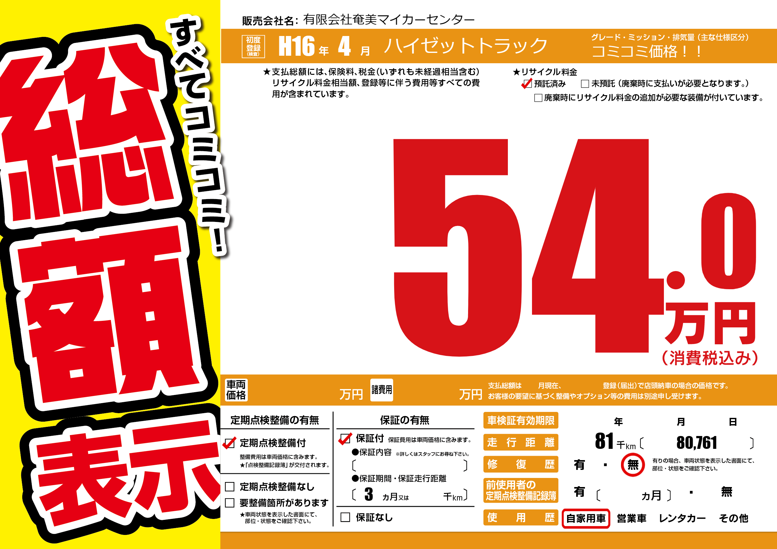 | 走行キロ | 8.1万km | 初年度登録 | H16年4月 |