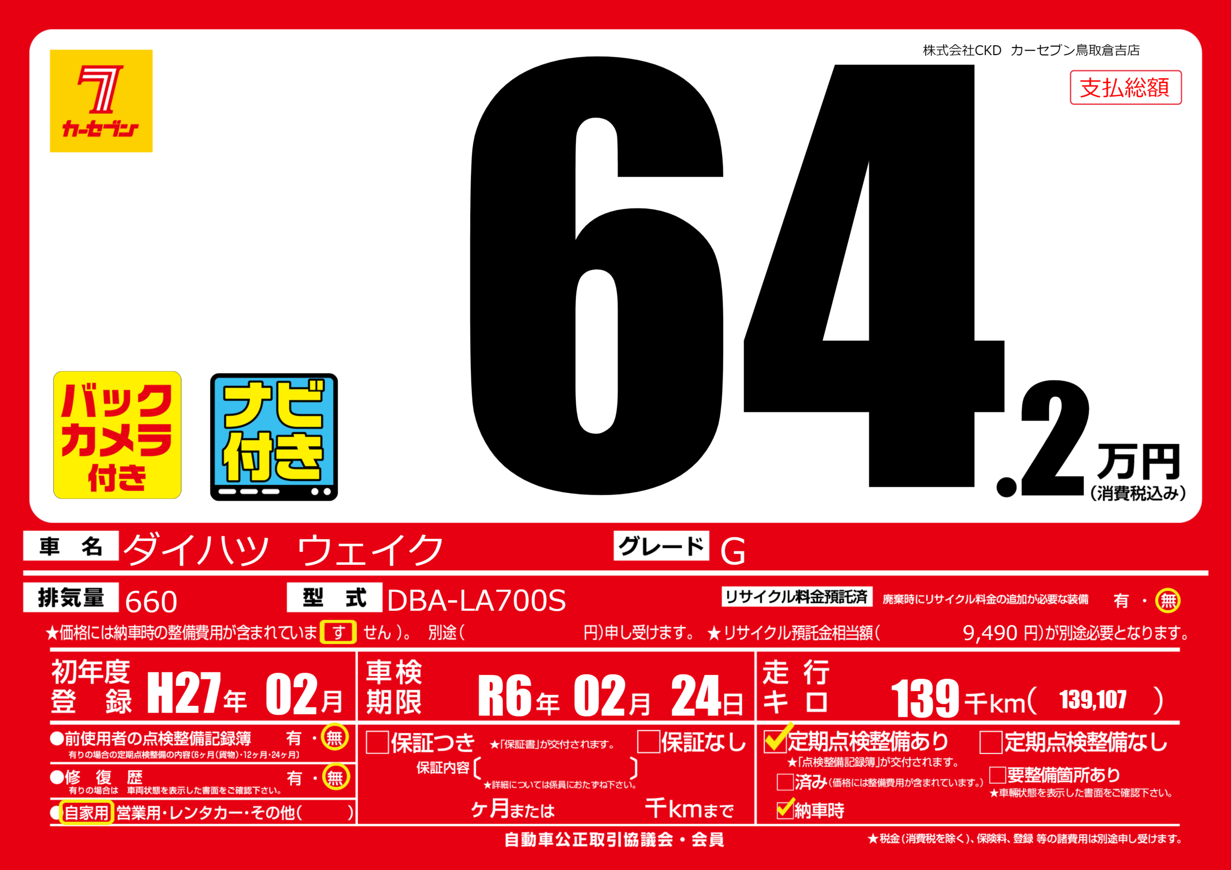 | 走行キロ | 13.9万km | 初年度登録 | H27年02月 |