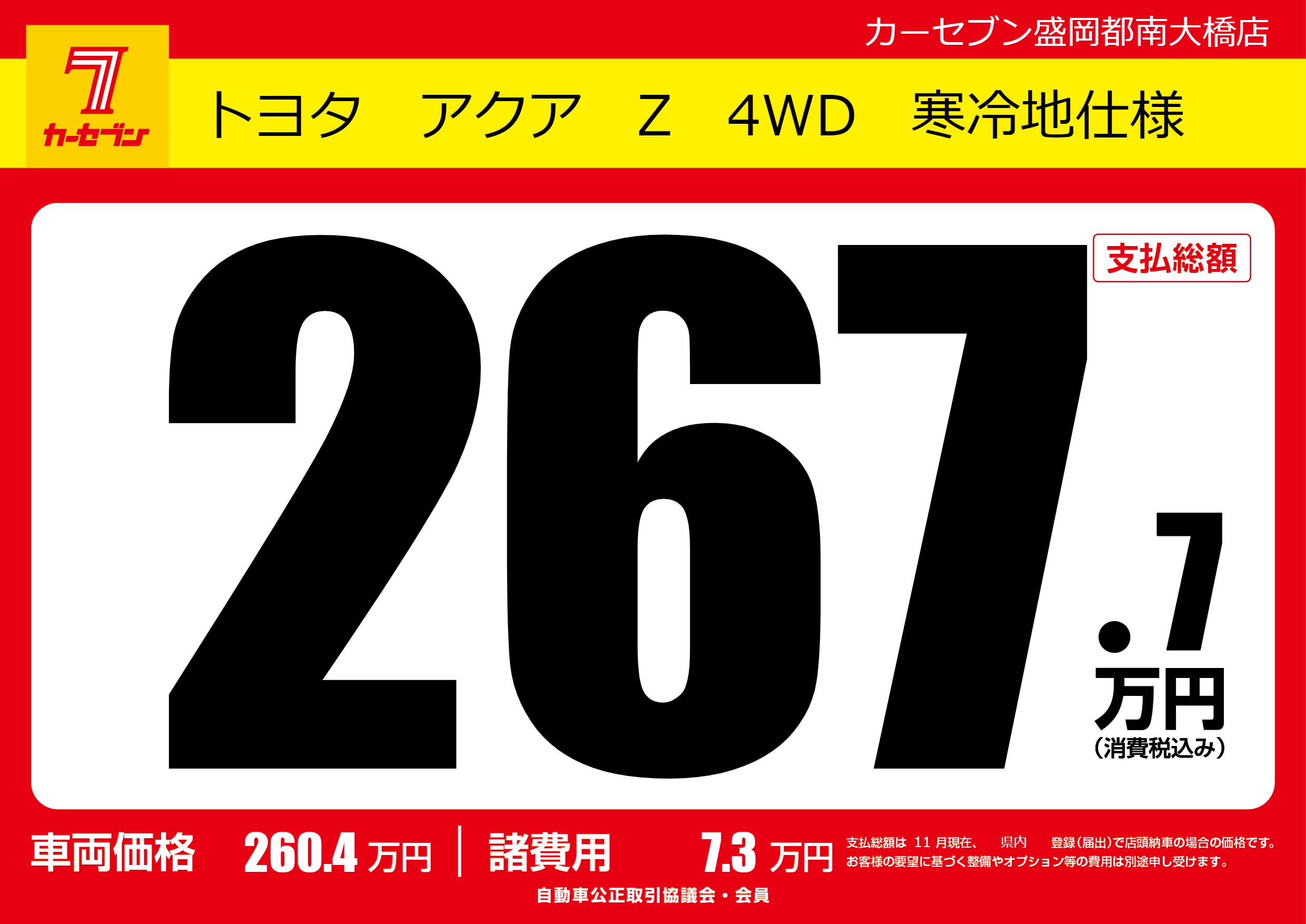 | 車名 | トヨタ アクア Z 4WD 寒冷地仕様 | グレード ミッション 排気量 |