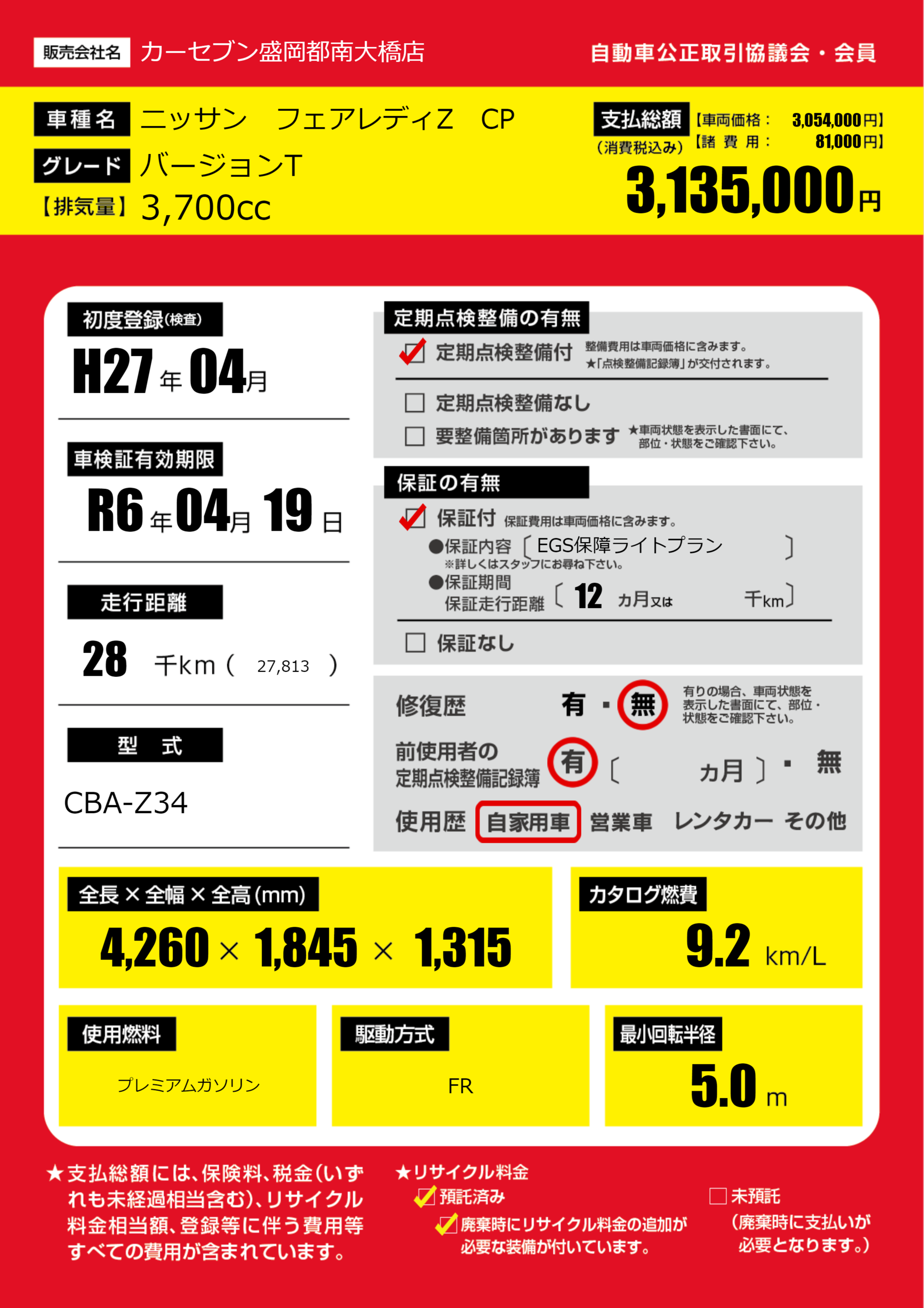 | 車名 | ニッサン フェアレディZ CP | グレード ミッション 排気量 |