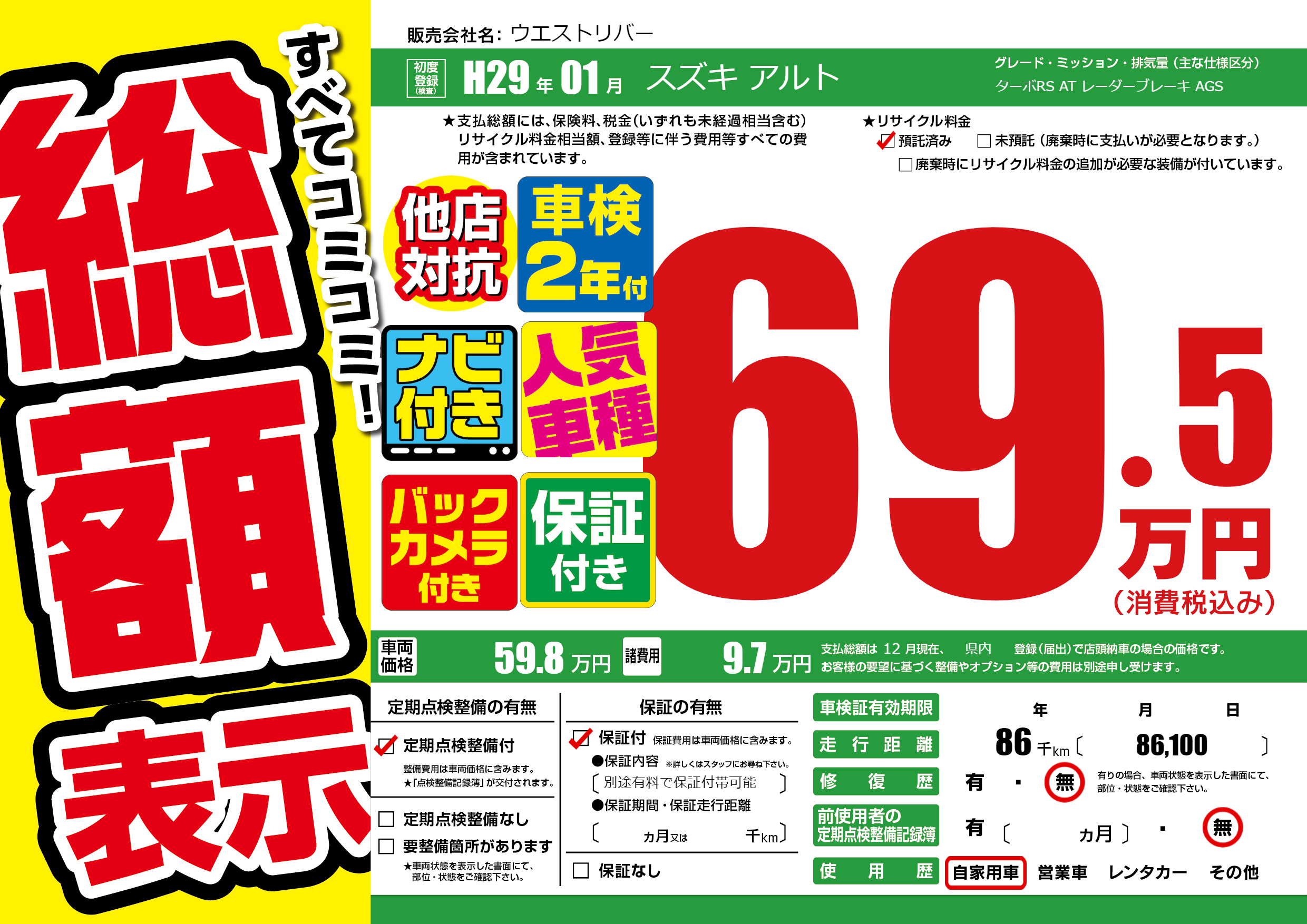 | 車名 | スズキ アルト | グレード ミッション 排気量 |