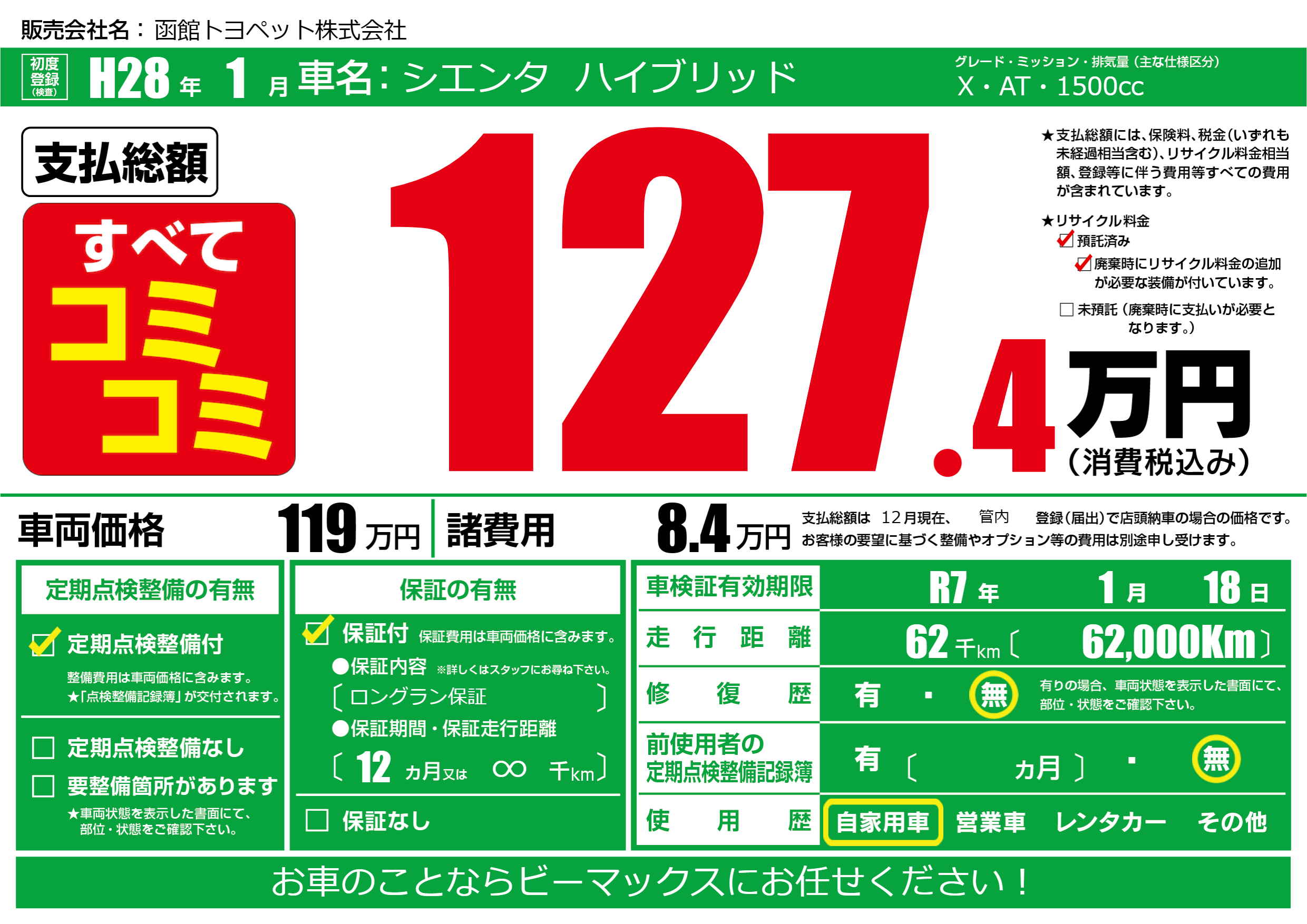 | 車名 | シエンタ ハイブリッド | グレード ミッション 排気量 |