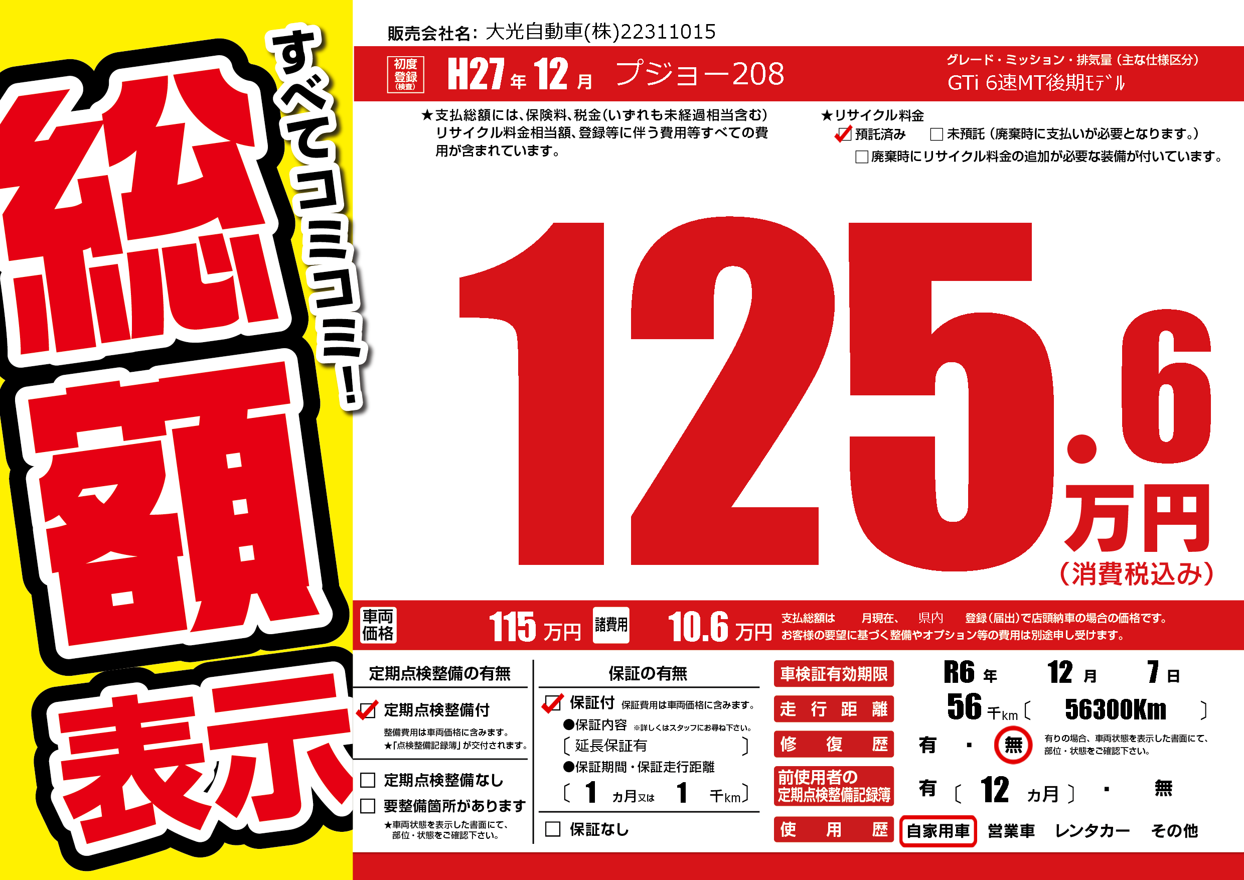 | 車名 | プジョー208 | グレード ミッション 排気量 |