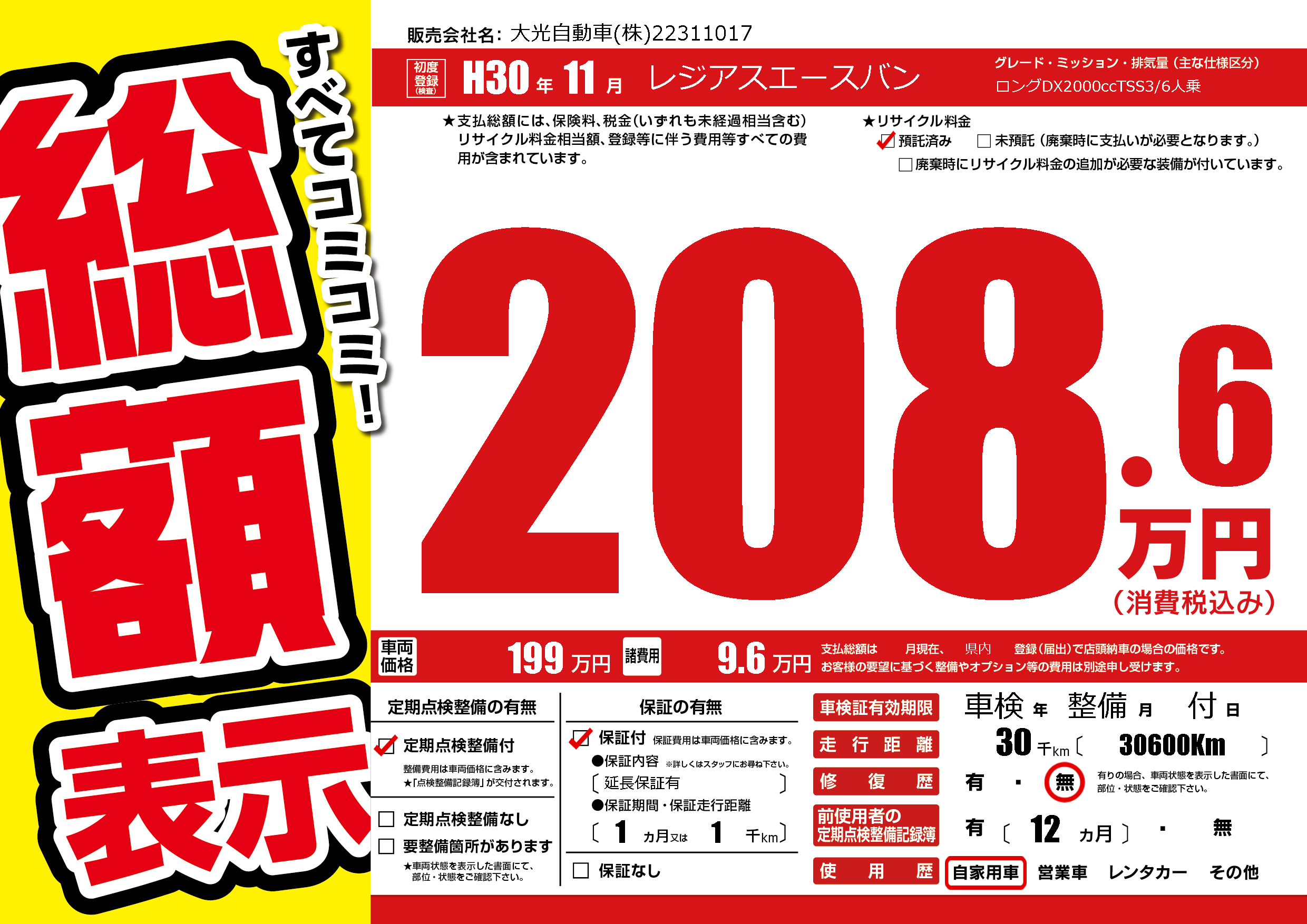 | 走行キロ | 3万km | 初年度登録 | H30年11月 |