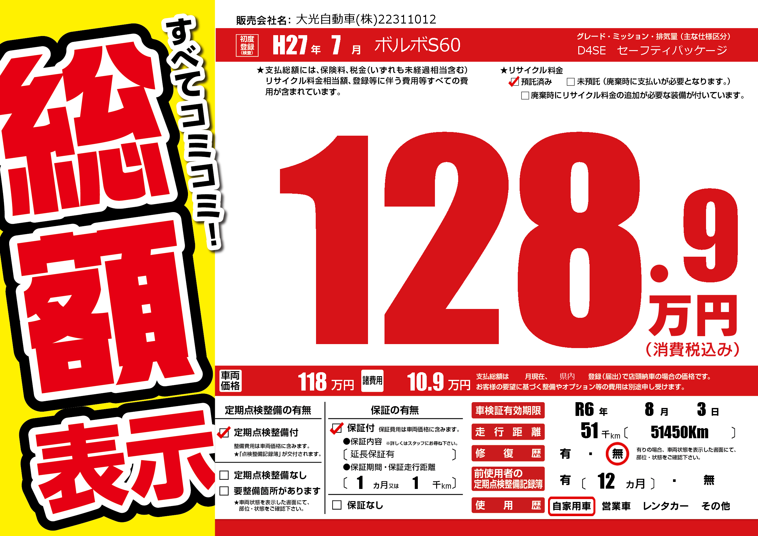 | 走行キロ | 5.1万km | 初年度登録 | H27年7月 |