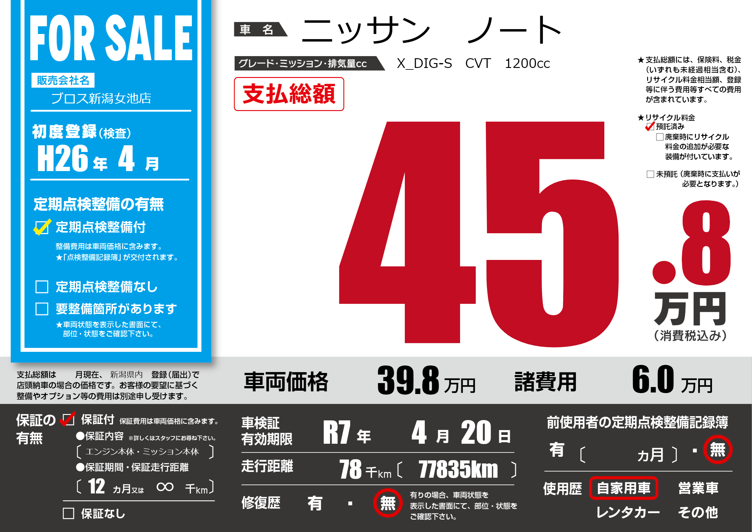 | 車名 | ニッサン ノート | グレード ミッション 排気量 |