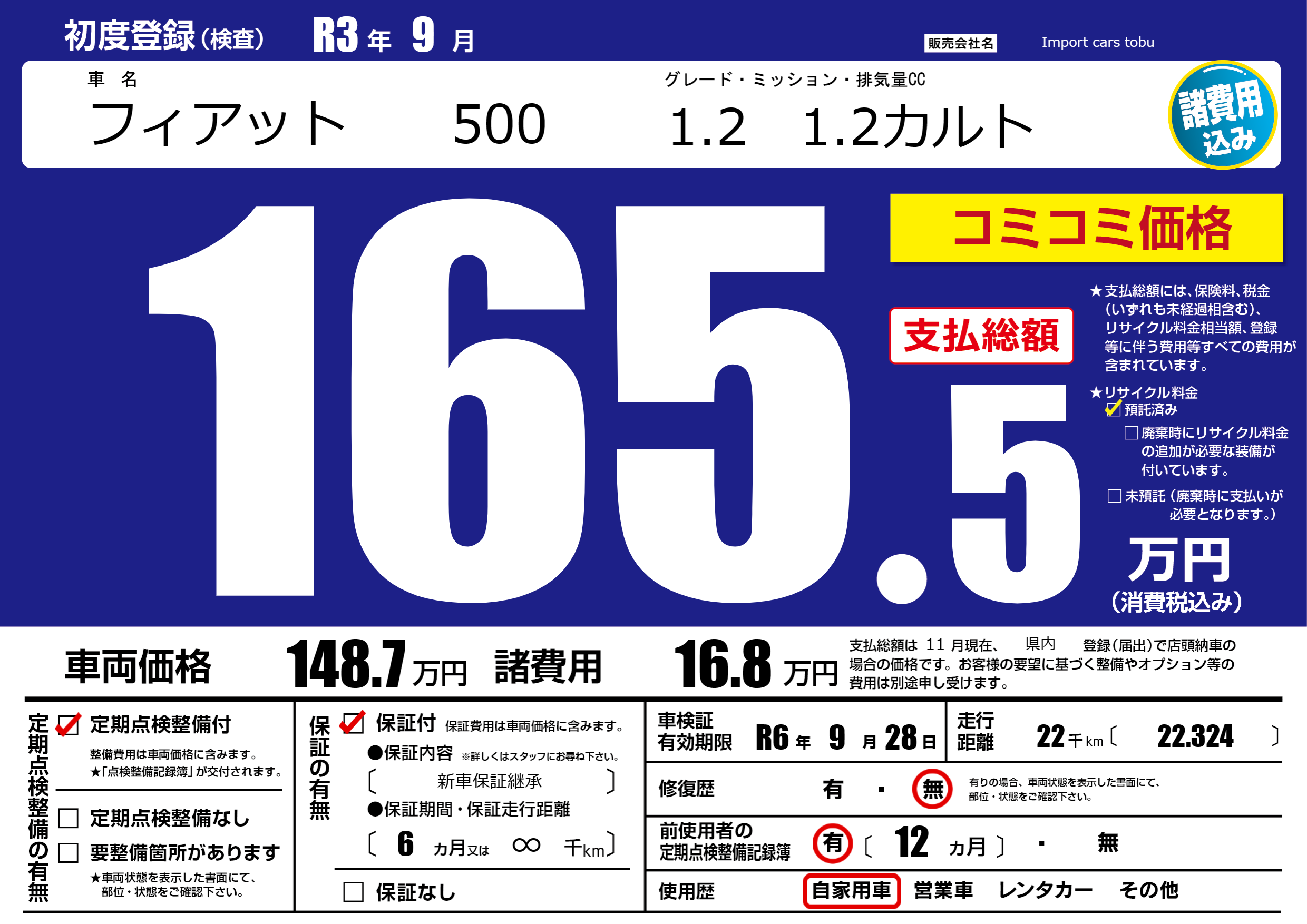 | 車名 | フィアット 500 | グレード ミッション 排気量 |
