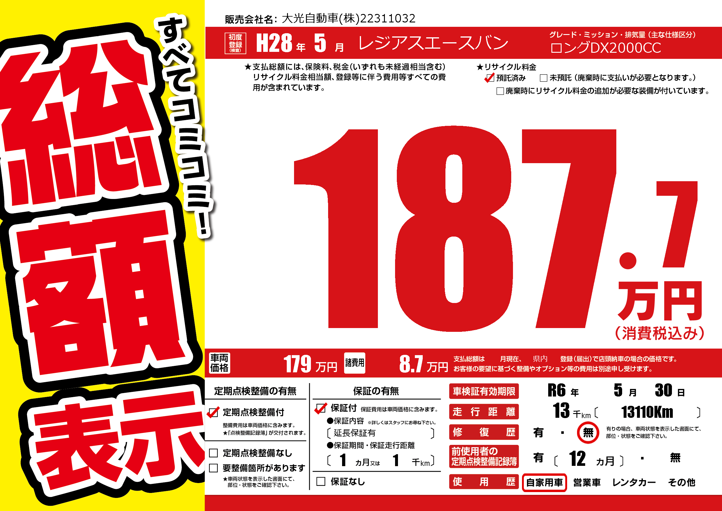 | 走行キロ | 1.3万km | 初年度登録 | H28年5月 |