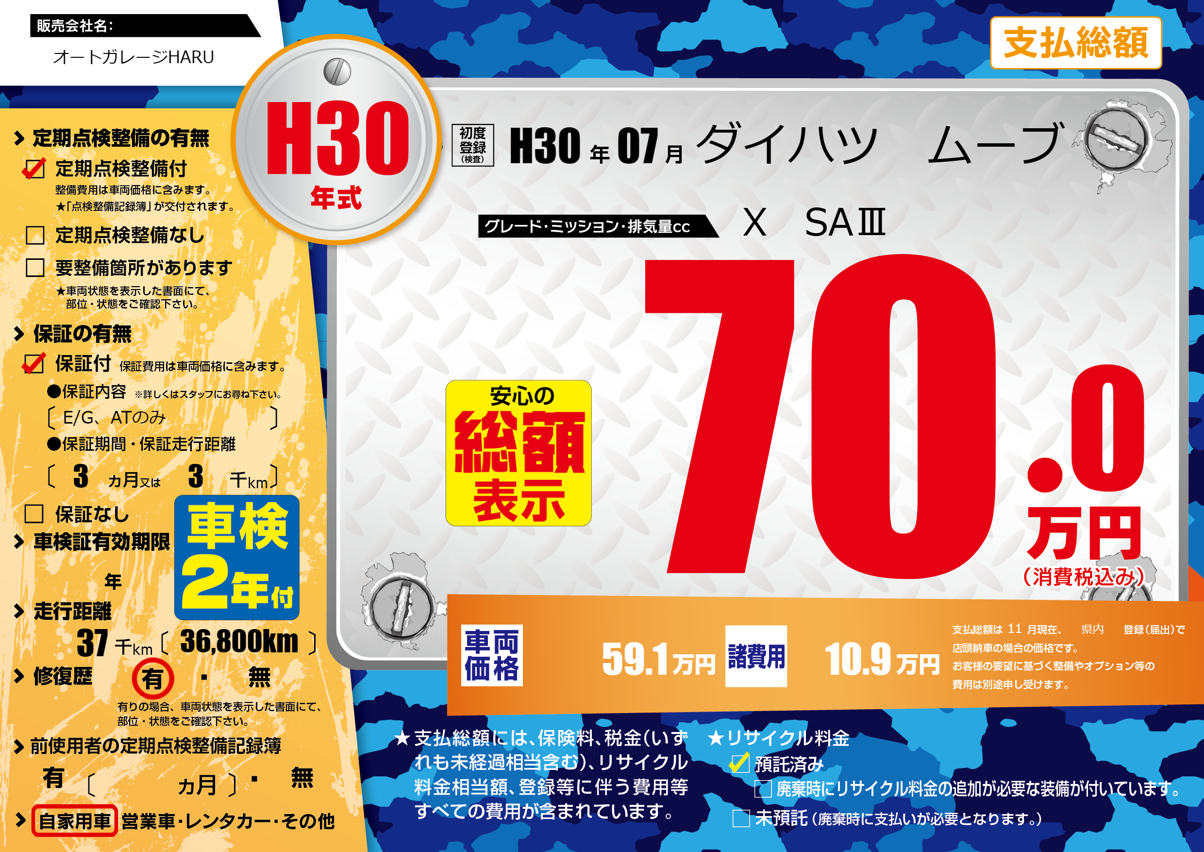 | 車名 | ダイハツ ムーブ | グレード ミッション 排気量 |