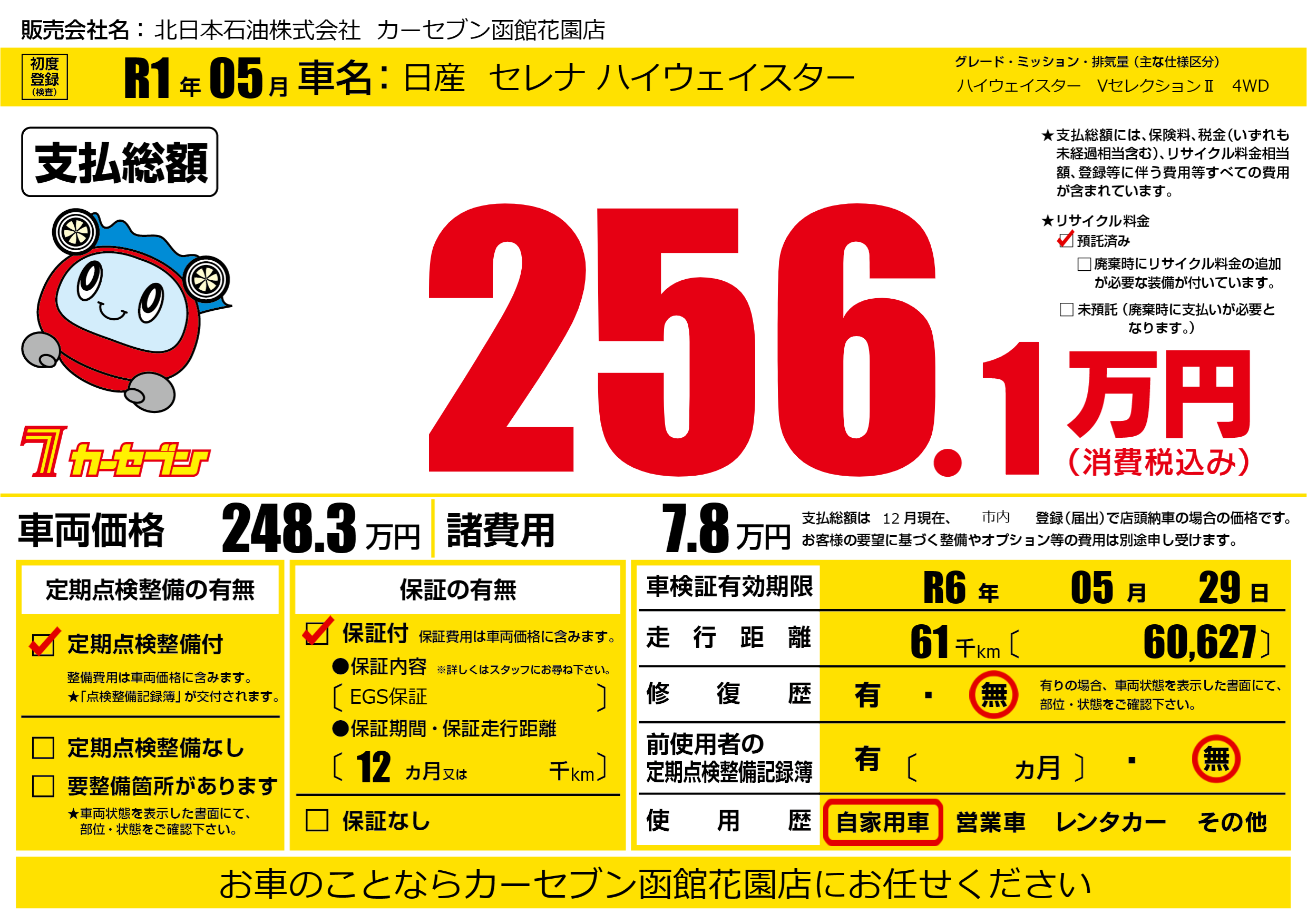 | 車名 | 日産 セレナ ハイウェイスター | グレード ミッション 排気量 |
