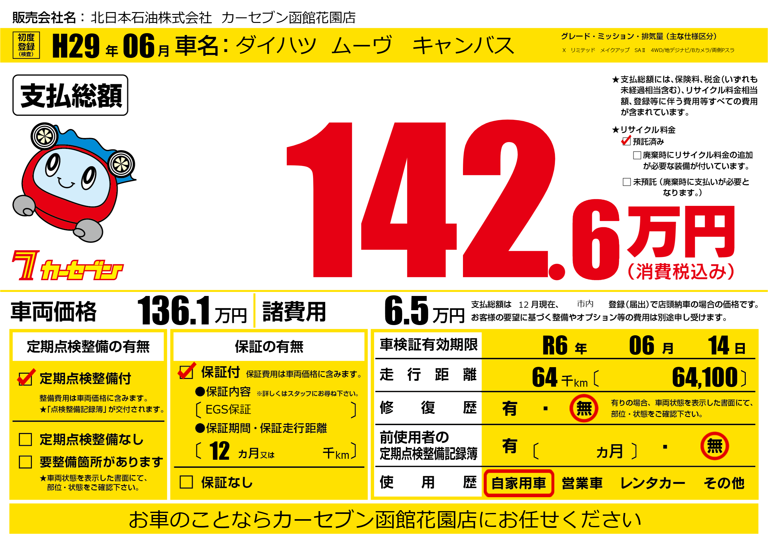 | 車名 | ダイハツ ムーヴ キャンバス | グレード ミッション 排気量 |