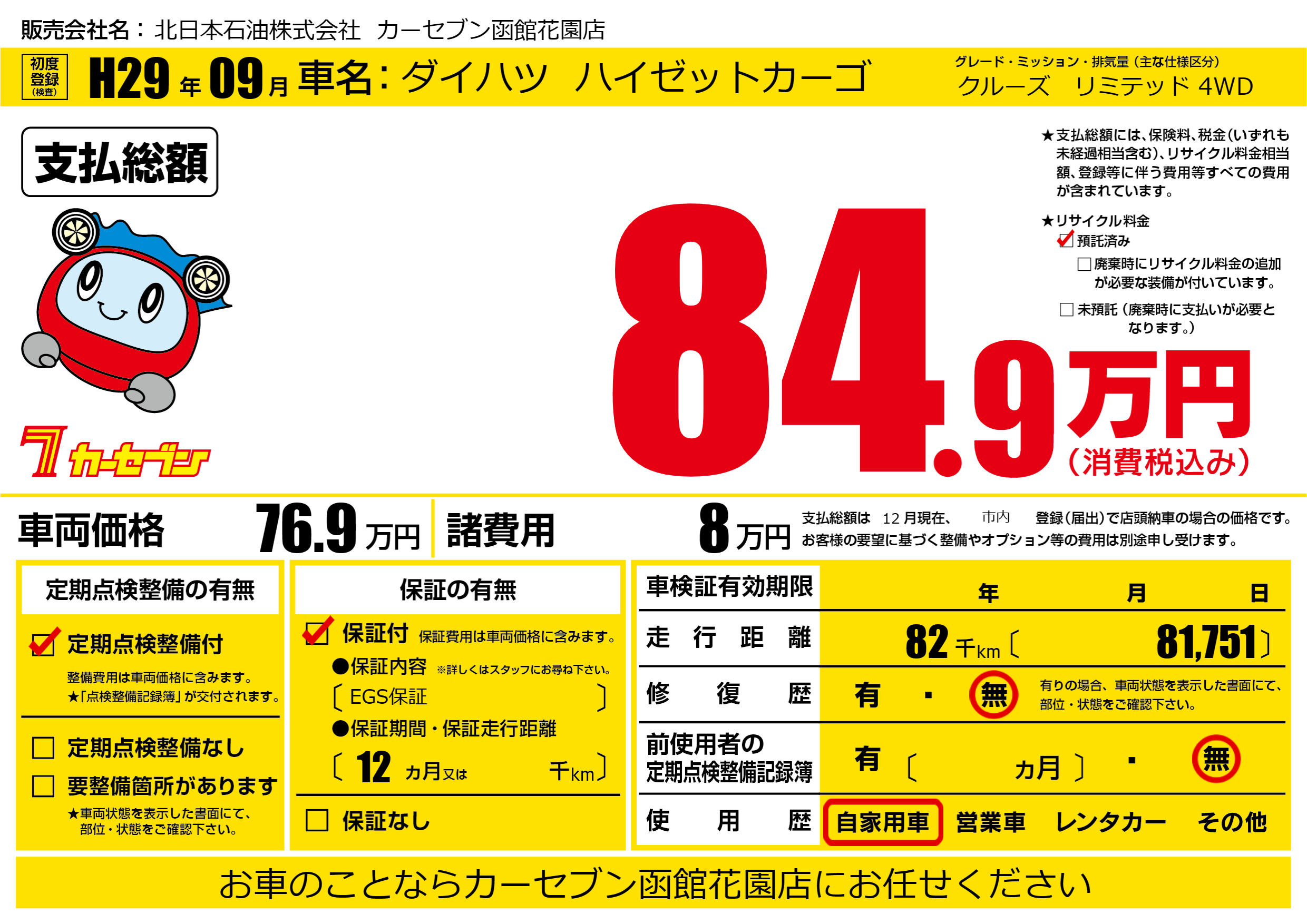 | 車名 | ダイハツ ハイゼットカーゴ | グレード ミッション 排気量 |