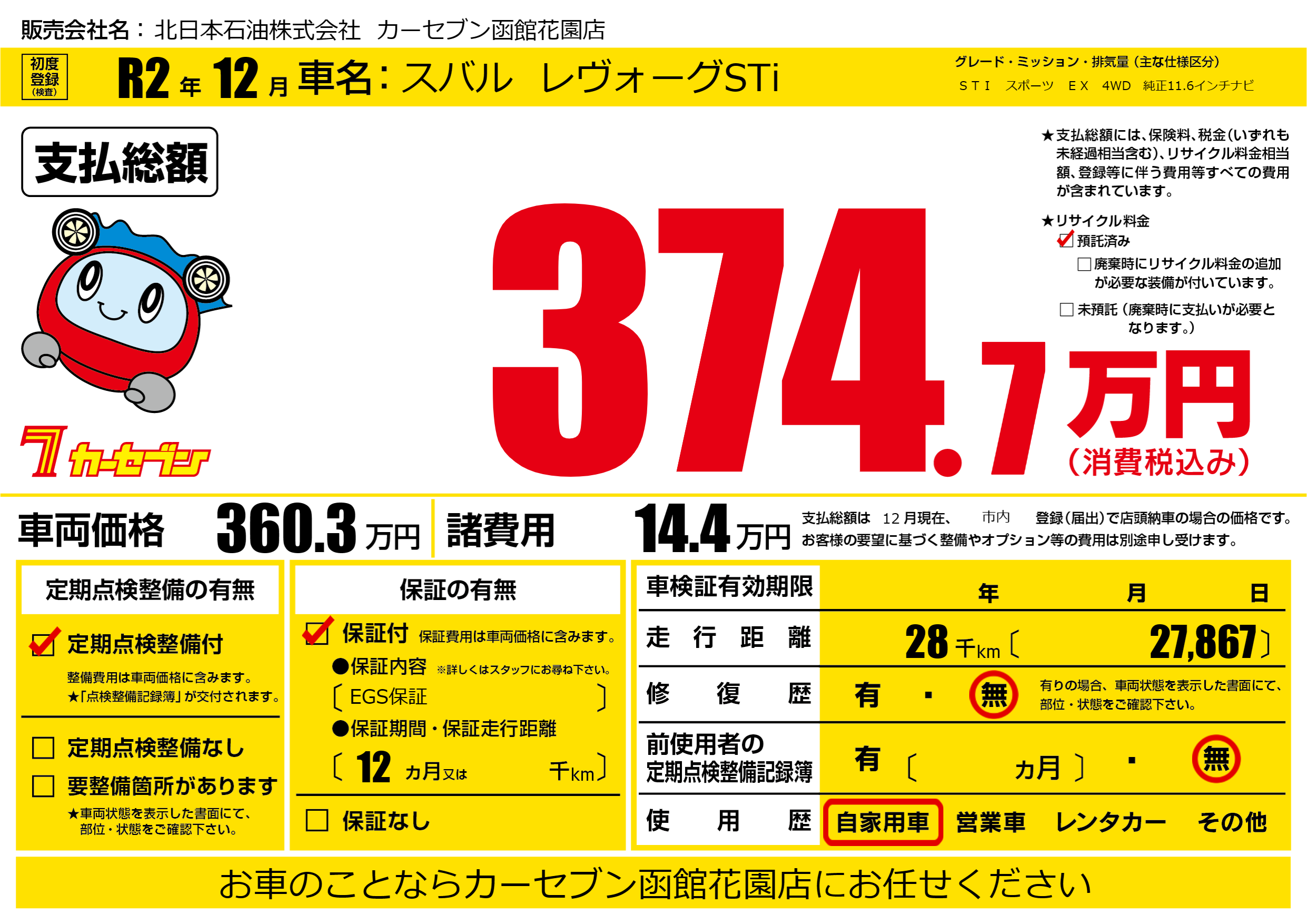 | 車名 | スバル レヴォーグSTi | グレード ミッション 排気量 |