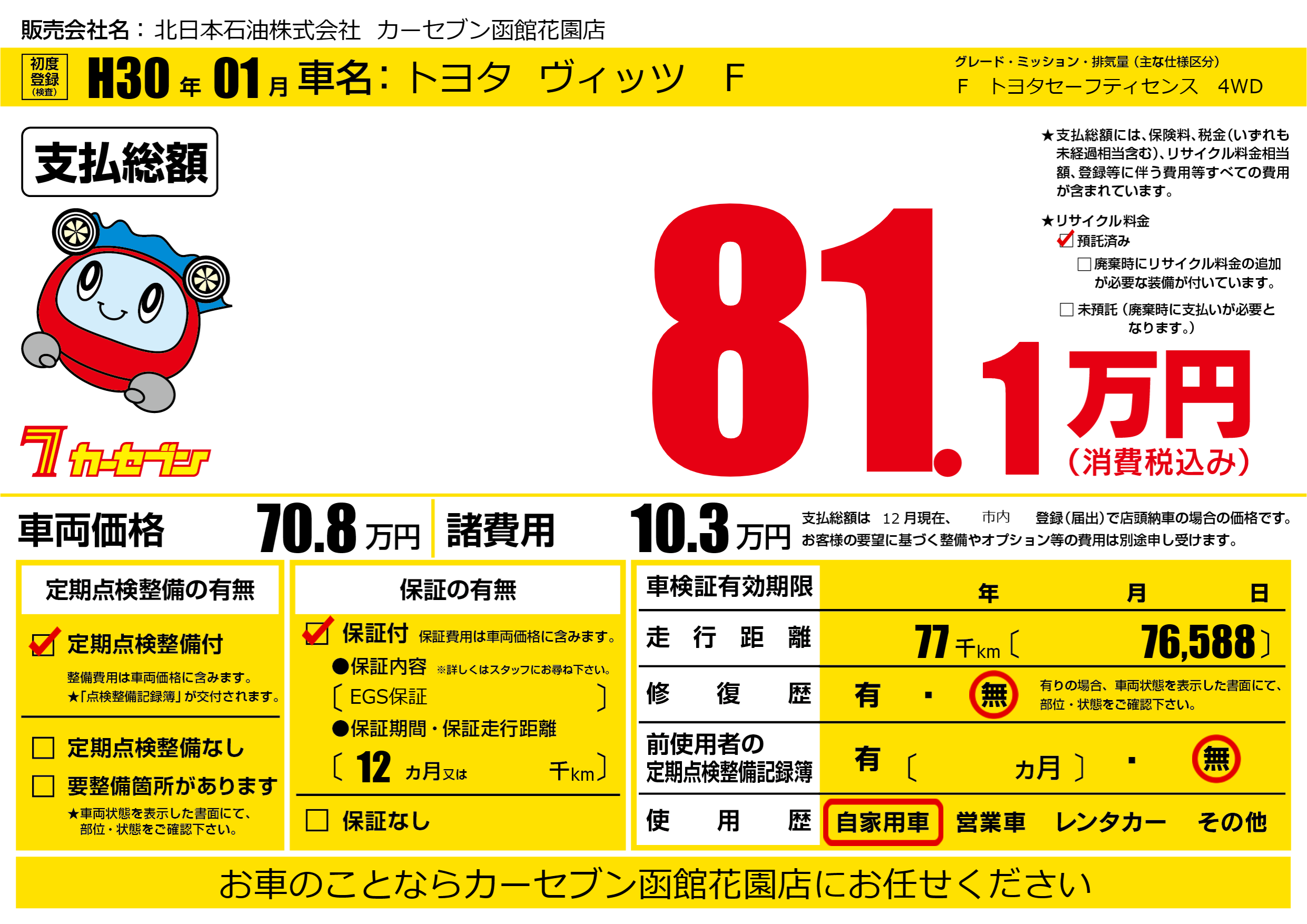 | 車名 | トヨタ ヴィッツ F | グレード ミッション 排気量 |
