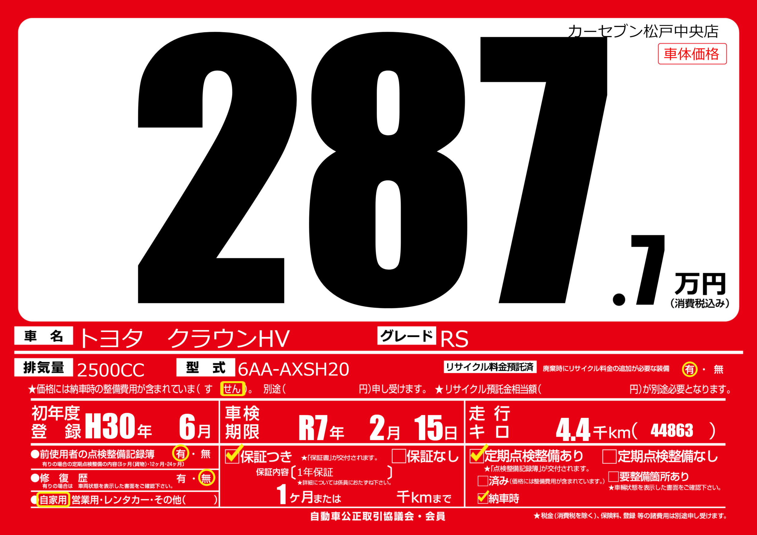 | 車名 | トヨタ クラウンHV | グレード ミッション 排気量 |
