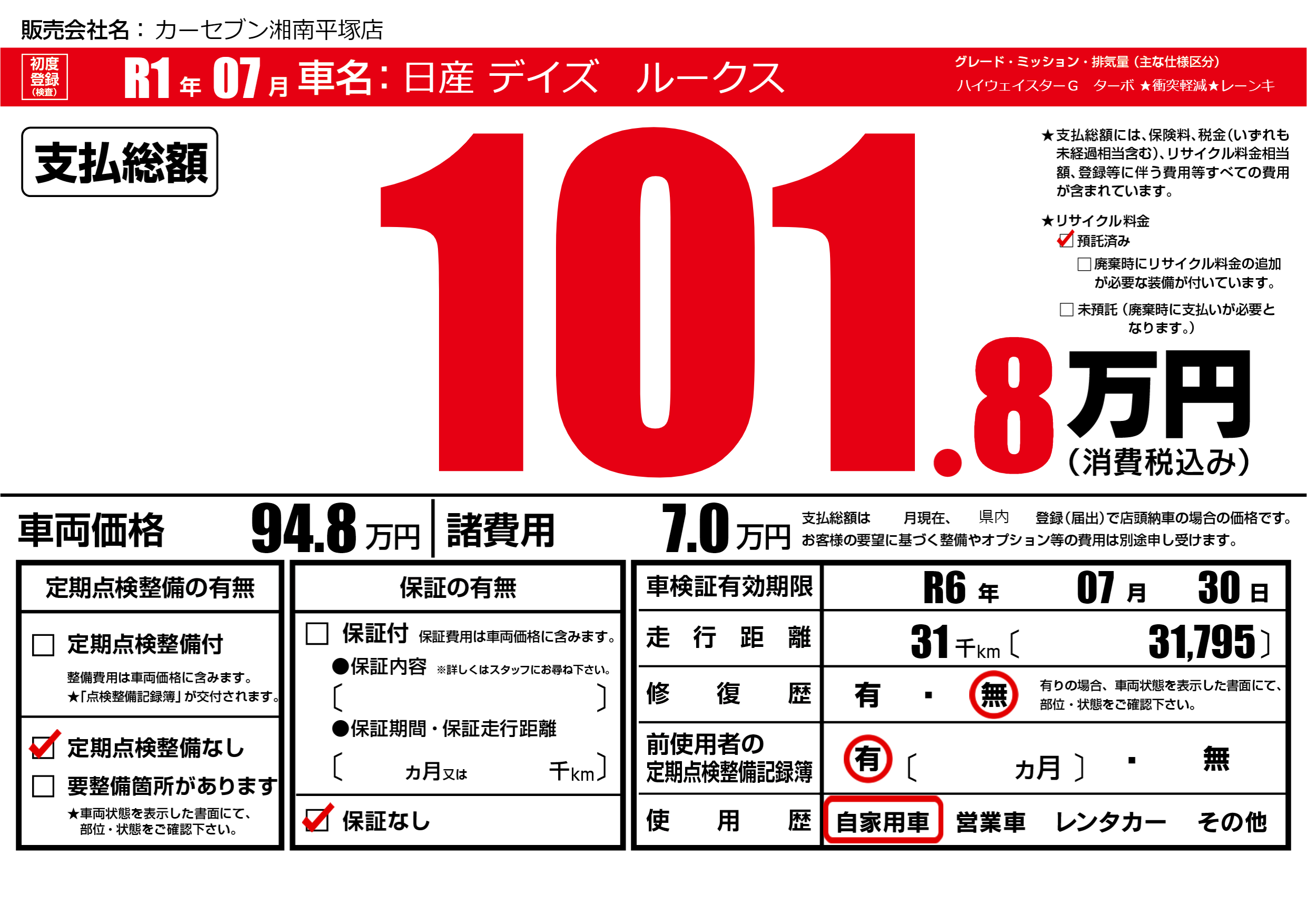 なし | 車検制限 | R6年07月30月 |