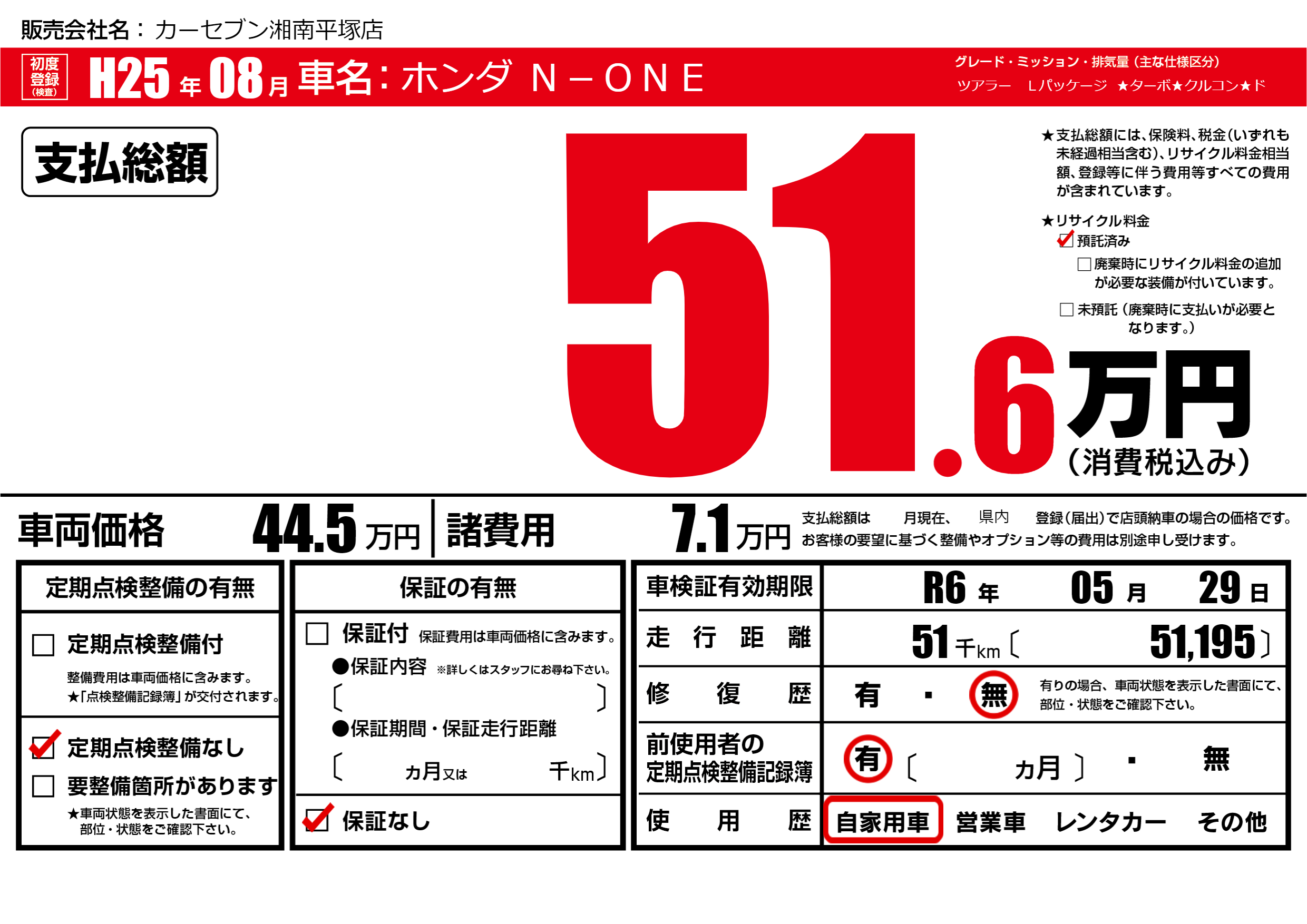 なし | 車検制限 | R6年05月29月 |