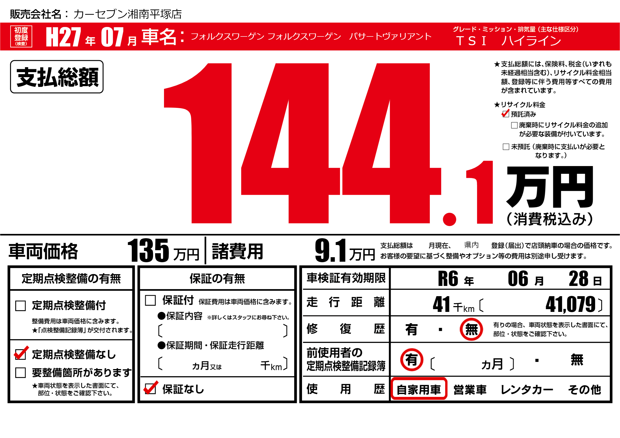 なし | 車検制限 | R6年06月28月 |