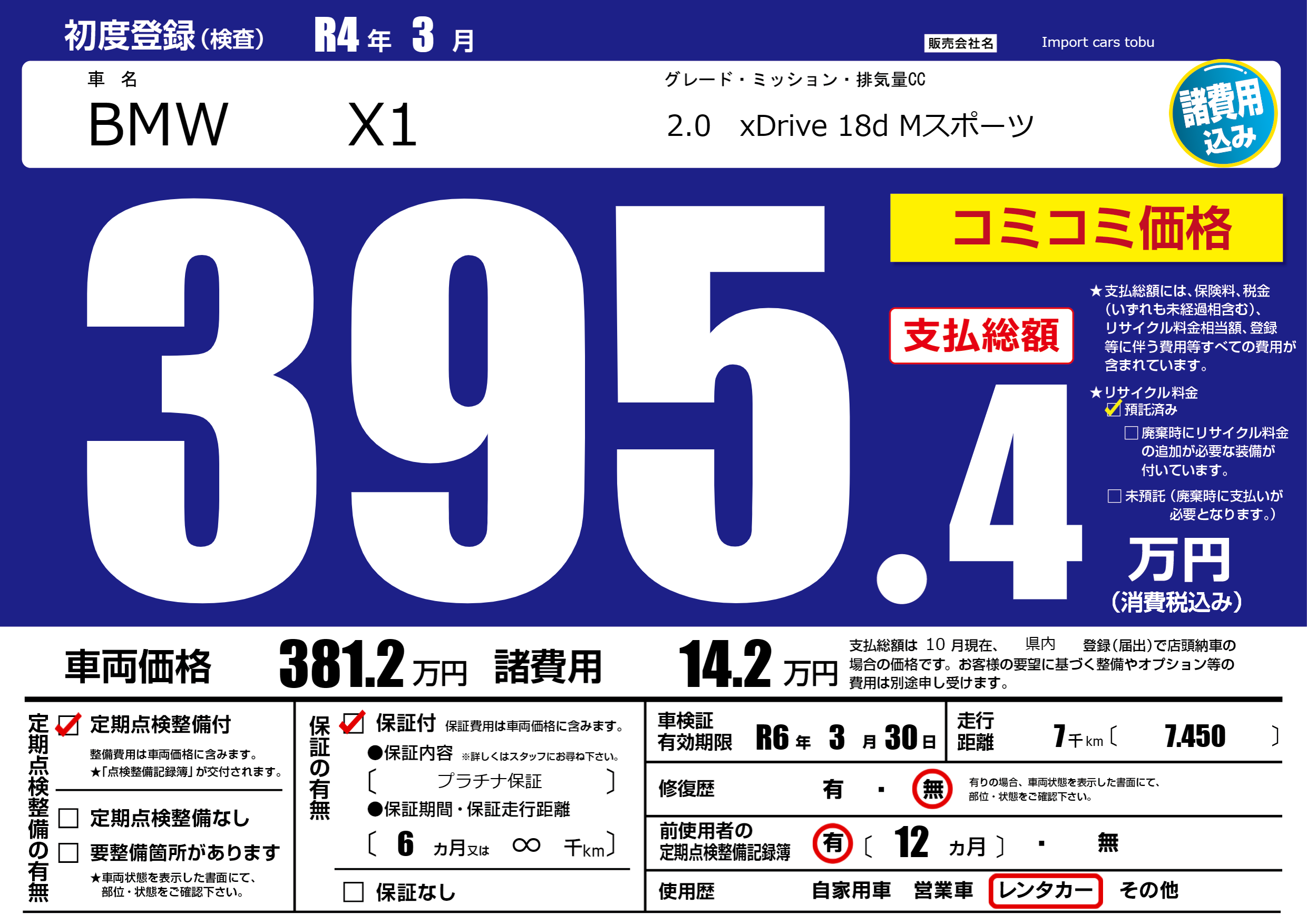 | 車名 | BMW X1 | グレード ミッション 排気量 |