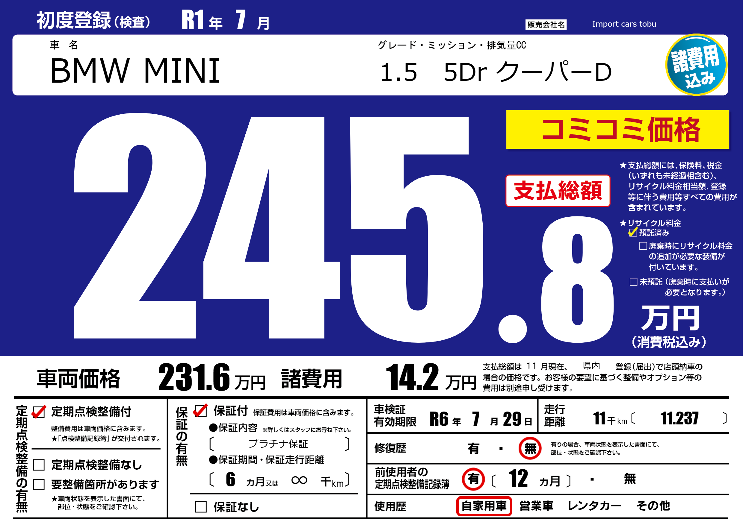 | 車名 | BMW MINI | グレード ミッション 排気量 |