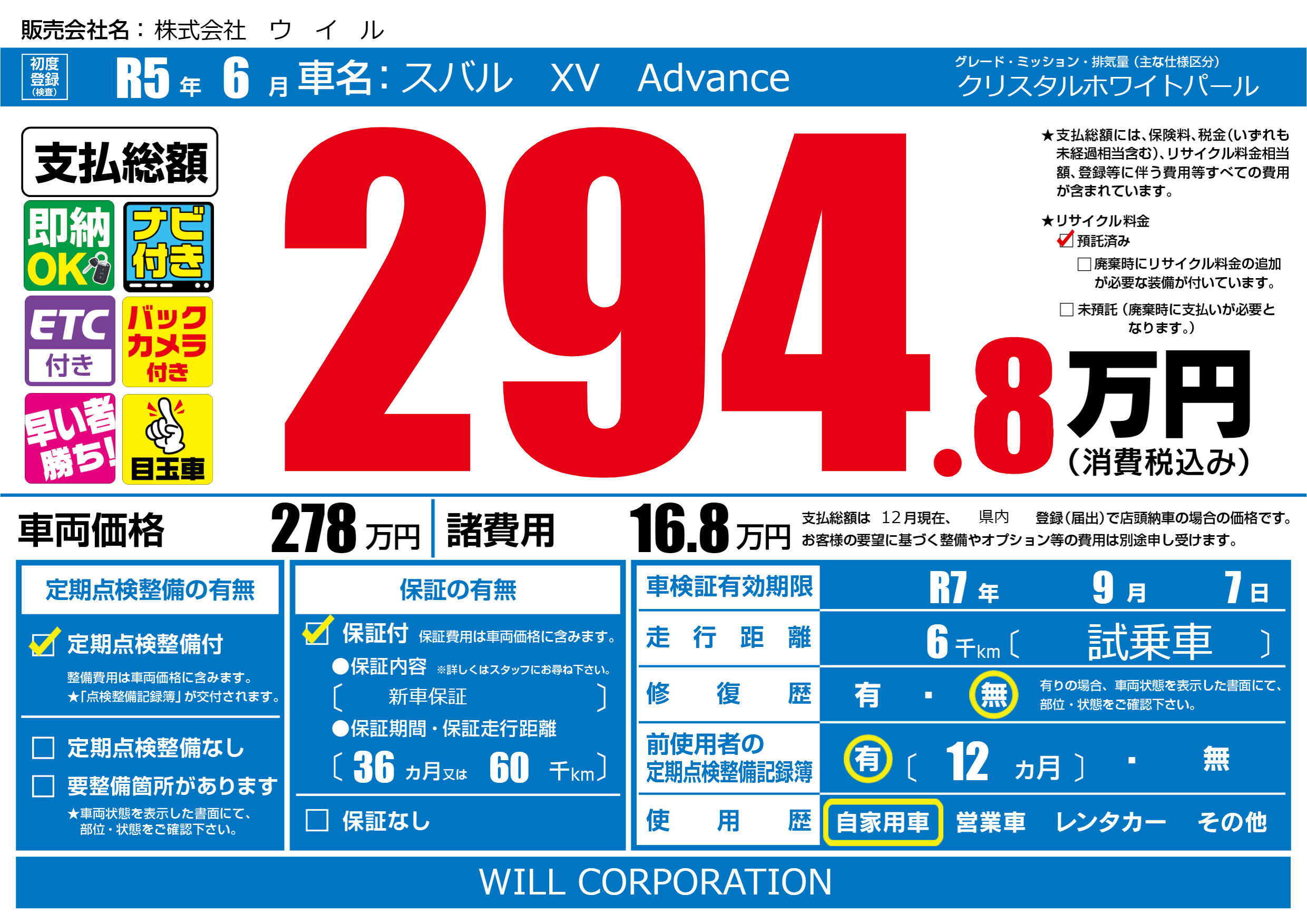 | 車名 | スバル XV Advance | グレード ミッション 排気量 |