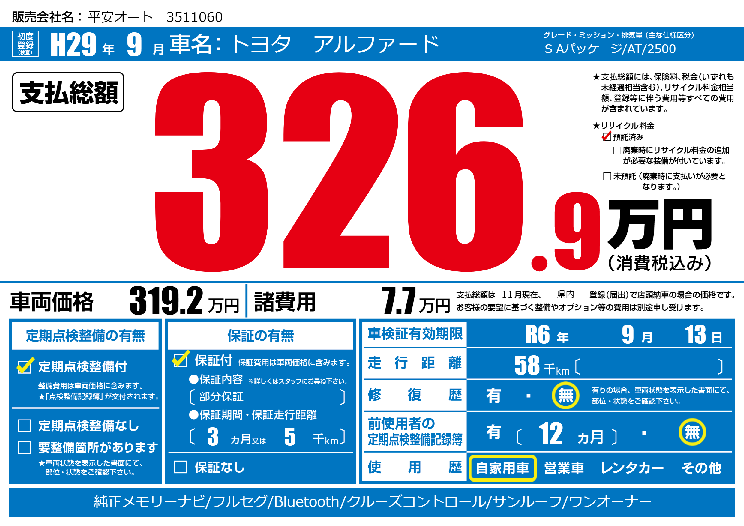 | 車名 | トヨタ アルファード | グレード ミッション 排気量 |