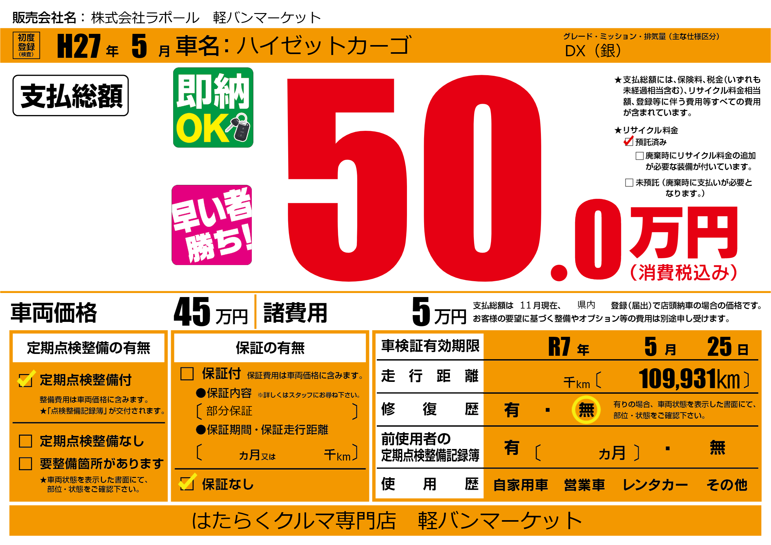 なし | 車検制限 | R7年5月25月 |