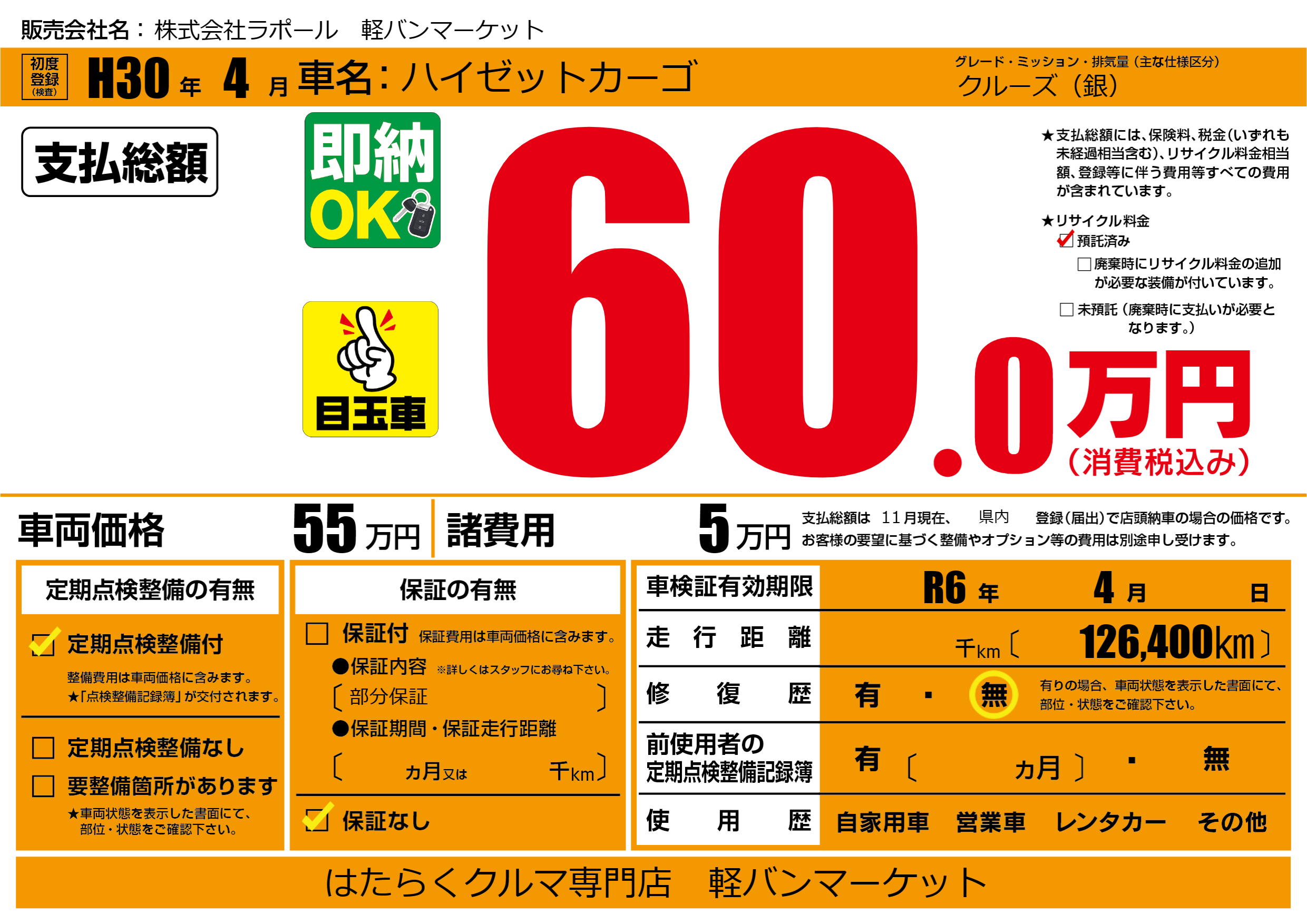 | 車名 | ハイゼットカーゴ | グレード ミッション 排気量 |